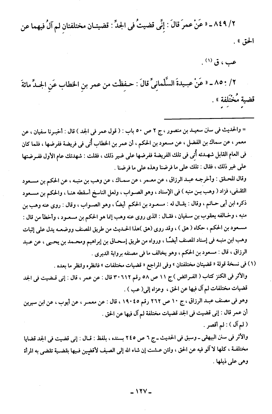 2/ 850 - "عَنْ عبيدةَ السَّلْمانِىِّ قالَ: حفِظْت من عمر بنِ الخطاب عَنِ الجدِّ مائةَ قضيةٍ مُخْتَلِفةٍ".