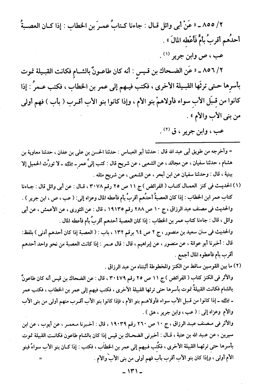 (¬1) الحديث في كنز العمال كتاب (الفرائض) ج 11 ص 25 رقم 3078، قال: عن أبى وائل قال: جاءنا كتاب عمر بن الخطاب: إذا كان العصبةُ أحدُهم أقربُ بأم فأعطه المال وعزاه إلى: (عب، ص، ابن جرير). والحديث في مصنف عبد الرزاق، ج 10 ص 288 رقم 19135، قال: عن الثورى، عن الأعمش، عن أبى وائل، قال: جاءنا كتاب عمر بن الخطاب: إذا كان العصبة أحدهم أقربُ بأم فأعطه المال.
