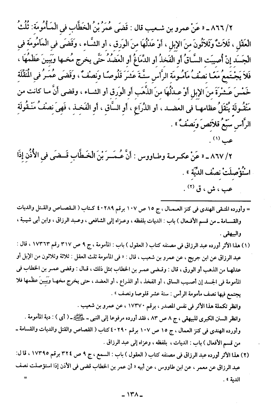 2/ 866 - "عَنْ عمرو بن شعيب قال: قَضَى عُمَرُ بْنُ الْخَطَّابِ فِى الْمَأُمُومَةِ: ثُلُثُ الْعَقْلِ، ثَلَاثٌ وَثَلَاثُونَ مِنَ الإِبِلِ، أَوْ عَدْلُهَا مِنَ الْوَرِقِ، أو الشَّاءِ، وَقضَى فِى الْمَأمُومَةِ فِى الْجَسَدِ إِنْ أُصِيبَتِ السَّاقُ أَوِ الْفَخِذُ أِو الدِّمَاغُ أَوِ الْعَضُدُ حَتَّى يخرج مُخها وَيَبِينَ عَظْمُهَا، فَلَا يَجْتَمِعُ مَعًا نِصْفُ مَأمُومَةِ الرَّأسِ سِتَّةَ عَشَرَ قَلُوصًا وَنِصْفٌ، وَقَضَى عُمَرُ فِى المُنَقِّلَةِ خَمْسَ عَشْرَةَ مِنَ الإِبِلِ أَوْ عِدْلُهَا مِنَ الذَّهَبِ أوِ الْوَرِقِ أو الشاء، وقضى أنَّ ما كانت من مَنْقُولَةٍ يُنْقَلُ عظامها في العضد، أو الذِّرَاعِ، أَوِ السَّاقِ، أَوِ الْفَخِذِ، فَهِىَ نِصْفُ مَنْقُولَةِ الرَّأسِ سَبْعُ قلَائِصَ وَنِصْفٌ".