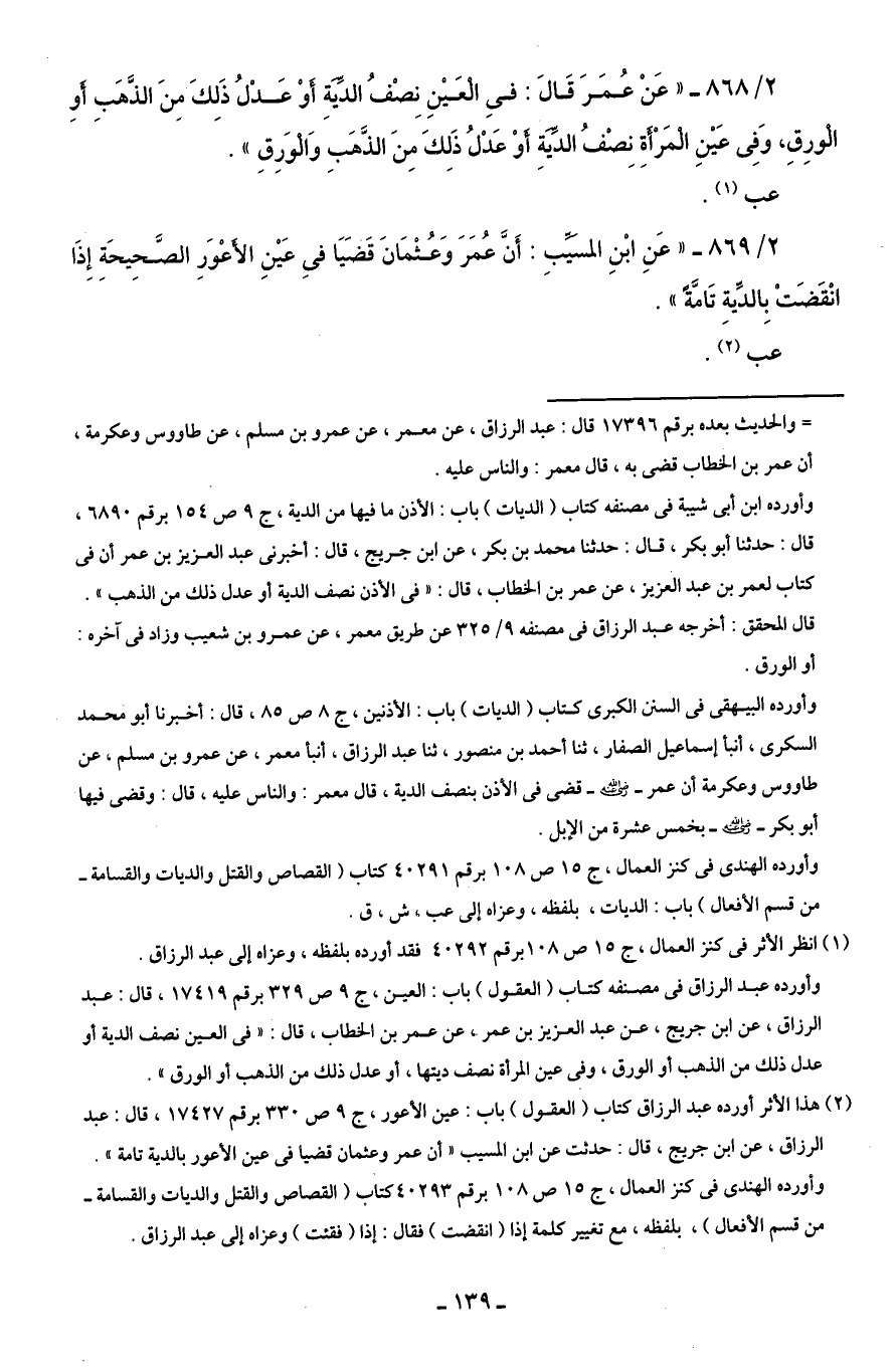 2/ 868 - "عَنْ عُمَرَ قَالَ: فِى الْعَيْنِ نِصْفُ الدِّيَةِ أَوْ عَدْلُ ذَلِكَ مِنَ الذَّهَبِ أَوِ الْورِقِ، وَفِى عَيْنِ الْمَرْأَةِ نِصْفُ الدِّيَةِ أَوْ عَدْلُ ذَلِكَ مِنَ الذَّهَبِ وَالْوَرِقِ".
