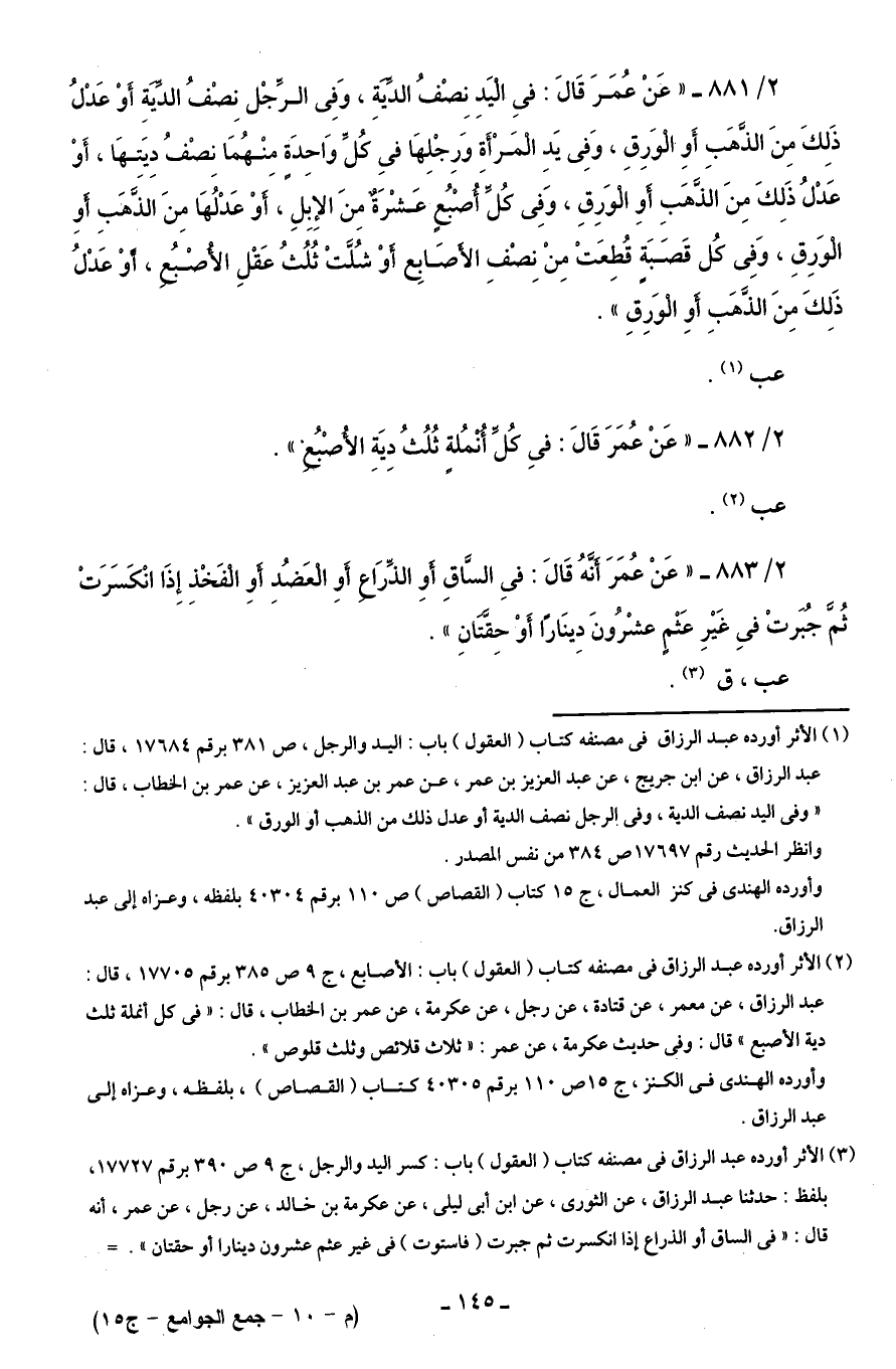 2/ 881 - "عَنْ عُمَرَ قَالَ: فِى الْيَدِ نِصْفُ الدِّيَةِ، وَفِى الرِّجْل نِصْفُ الدِّيَةِ أَوْ عَدْلُ ذَلِكَ مِنَ الذَّهبِ أَوِ الْوَرِقِ، وَفِى يَدِ الْمَرْأةَ وَرِجْلِهَا فِى كُلِّ وَاحِدَةٍ مِنْهُمَا نِصْفُ دِيَتِهَا، أَوْ عَدْلُ ذَلِكَ مِنَ الذَّهَبِ أَوِ الْوَرِقِ، وَفِى كُلِّ أُصْبُعٍ عَشْرَةٌ مِنَ الإِبِلِ، أَوْ عَدْلُهَا مِنَ الذَّهَبِ أَوِ الْوَرِقِ، وَفِى كُل قَصَبَةٍ قُطِعَتْ مِنْ نِصْفِ الأَصَابِع أَوْ شُلَّتْ ثُلُثُ عَقْلِ الأُصْبُعِ، أوْ عَدْلُ ذَلِكَ مِنَ الذَّهَبِ أَوِ الْوَرِقِ".