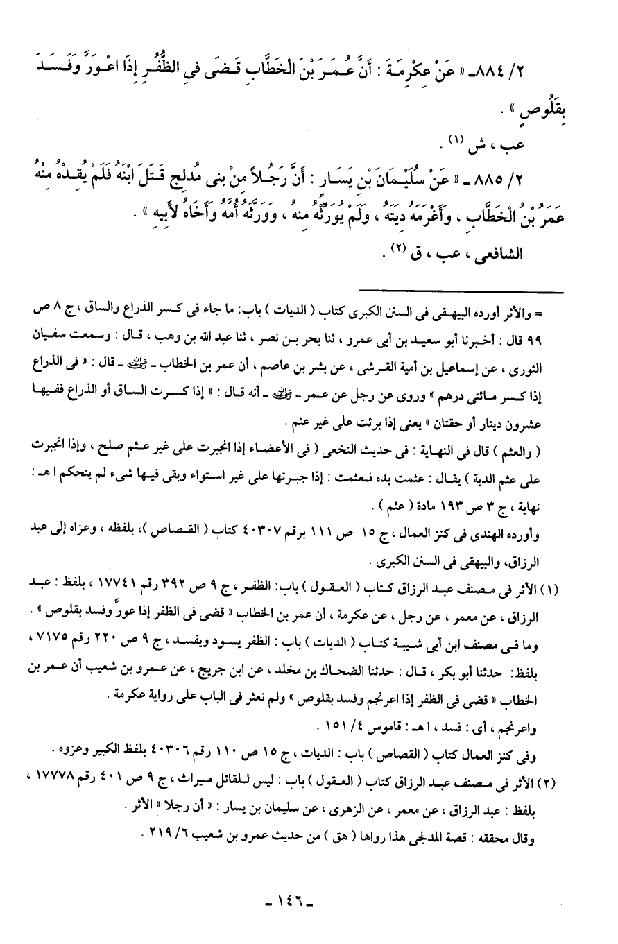 (¬1) الأثر في مصنف عبد الرزاق كتاب (العقول) باب: الظفر، ج 9 ص 392 رقم 17741، بلفظ: عبد الرزاق، عن معمر، عن رجل، عن عكرمة، أن عمر بن الخطاب "قضى في الظفر إذا عورَّ وفسد بقلوص". وما في مصنف ابن أبى شيبة كتاب (الديات) باب: الظفر يسود ويفسد، ج 9 ص 220 رقم 7175، بلفظ: حدثنا أبو بكر، قال: حدثنا الضحاك بن مخلد، عن ابن جريج، عن عمرو بن شعيب أن عمر بن الخطاب "قضى في الظفر إذا اعرنجم وفسد بقلوص" ولم نعثر في الباب على رواية عكرمة.