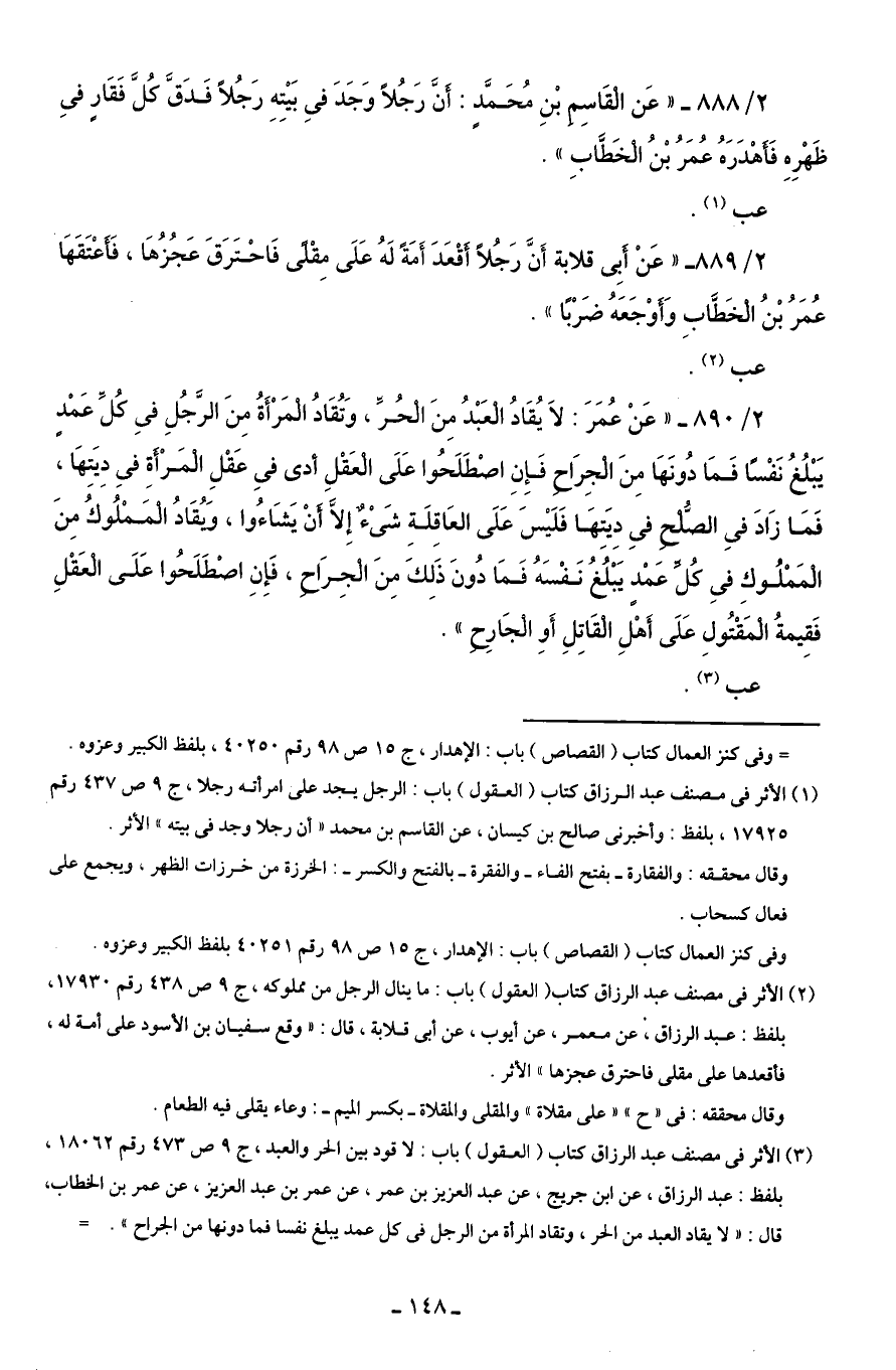 (¬3) الأثر في مصنف عبد الرزاق كتاب (العقول) باب: لا قود بين الحر والعبد، ج 9 ص 473 رقم 18062، بلفظ: عبد الرزاق، عن ابن جريج، عن عبد العزيز بن عمر، عن عمر بن عبد العزيز، عن عمر بن الخطاب، قال: "لا يقاد العبد من الحر، وتقاد المرأة من الرجل في كل عمد يبلغ نفسا فما دونها من الجراح". =