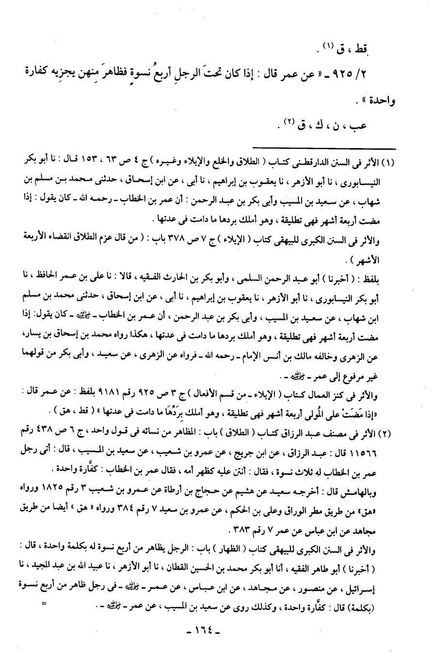2/ 925 - "عن عمر قال: إذا كان تحتَ الرجلِ أربعُ نسوةٍ فظاهرَ مِنهن يجزِيه كفارة واحدة".