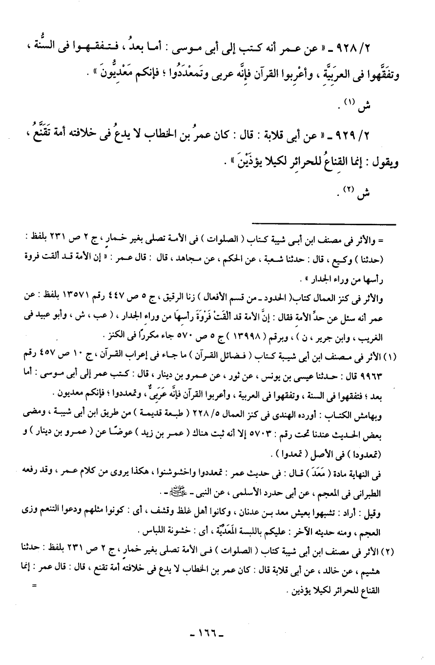 2/ 928 - "عن عمر أنه كتب إلى أبى موسى: أما بعدُ، فتفقهوا في السُّنة، وتفَقَّهوا في العرَبِيَّةِ، وأعْرِبوا القرآن فإِنَّه عربى وتَمعْدَدُوا؛ فإنكم مَعْدِيُّونَ".