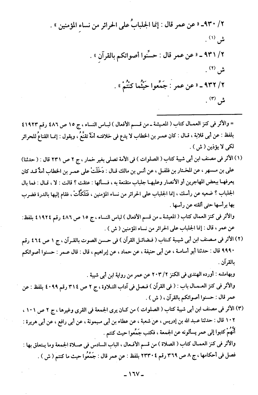 2/ 930 - "عن عمر قال: إنما الجلبابُ على الحرائر من نساءِ المؤمنين"