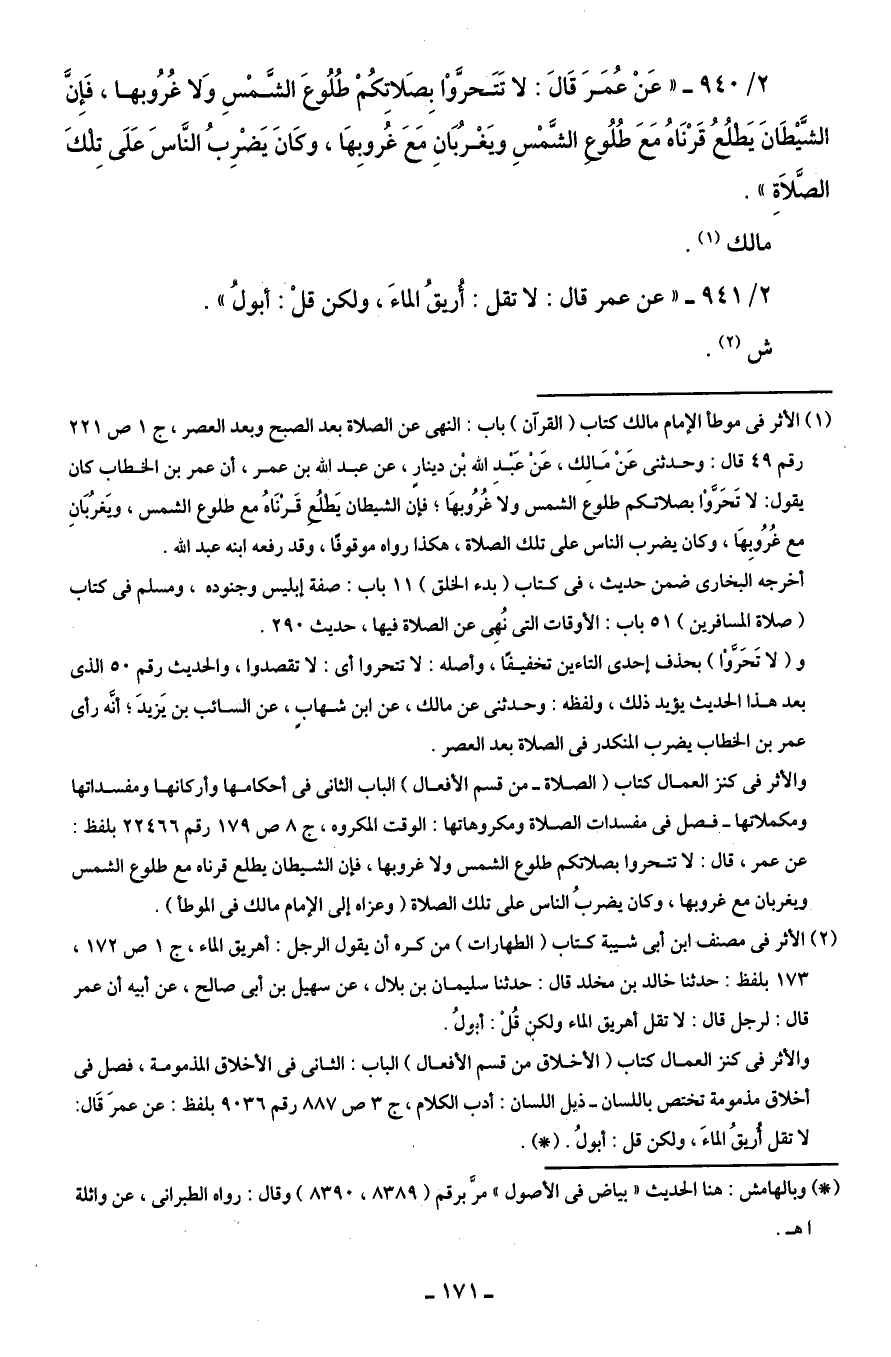 2/ 941 - "عن عمر قال: لا تقل: أُريقُ الماءَ، ولكن قلْ: أبولُ".