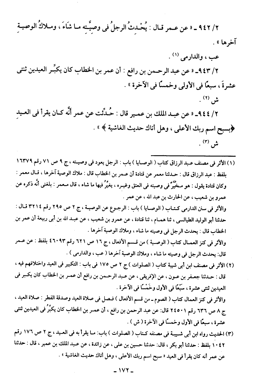 (¬2) الأثر في مصنف ابن أبى شيبة كتاب (الصلوات) ج 2 ص 175 في باب: التكبير في العيد واختلافهم فيه، قال: حدثنا جعفر بن عون، عن الإفريقى، عن عبد الرحمن بن رافع أن عمر بن الخطاب كان يكبر في العيدين ثنتى عشرة، سَبْعًا في الأول وخَمْسًا في الآخرة.