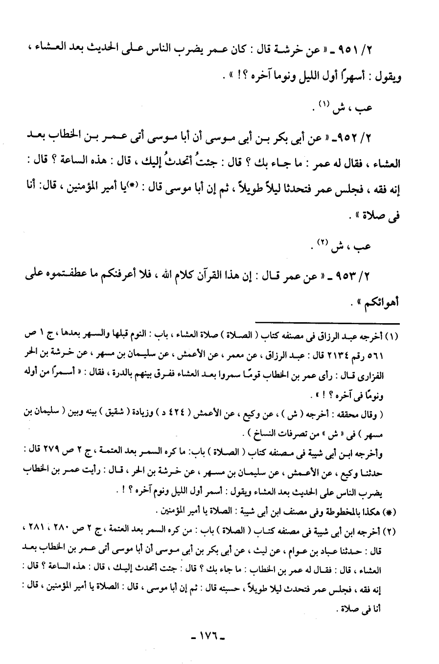 2/ 951 - "عن خرشة قال: كان عمر يضرب الناس على الحديث بعد العشاء، ويقول: أسهرًا أول الليل ونوما آخره؟ ! ".