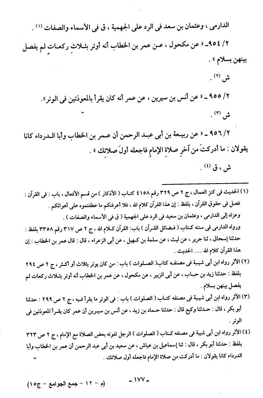 (¬2) الأثر رواه ابن أبى شيبة في مصنفه كتاب (الصلوات) باب: من كان يوتر بثلاث أو أكثر، ج 2 ص 294 بلفظ: حدثنا زيد بن حباب، عن أبى الزبير، عن مكحول، عن عمر بن الخطاب أنه أوتر بثلاث ركعات لم يفصل بينهن بسلام.