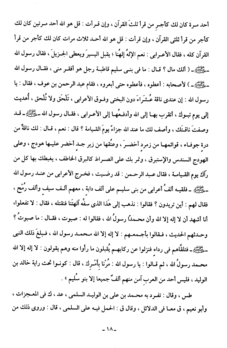 أحد مرة كان لك كأجرِ من قرأ ثلثَ القرآن، وإن قرأت: قل هو الله أحد مرتين كان لك كأجر من قرأ ثلثى القرآن، وإن قرأت: قل هو الله أحد ثلاث مرات كان لك كأجر من قرأ القرآن كله، فقال الأعرابى: نعم الإلهُ إلهُنا؛ يقبل اليسيرَ ويعطى الجزيلَ، فقال رسول الله - صلى الله عليه وسلم - (ألك مال؟ قال: ما في بنى سليم قاطبة رجل هو أفقر منى، فقال رسول الله - صلى الله عليه وسلم -) لأصحابه: أعطوه، فأعطوه حتى أبعروه، فقام عبد الرحمن بن عوف، فقال: يا رسول الله: إن عندى ناقة عُشَراءَ دون البختى وفوق الأعرابى، تَلْحَق ولا تُلْحق، أُهديت إلى يوم تبوك، أتقرب بها إلى الله وأدفعُها إلى الأعرابى، فقال رسول الله - صلى الله عليه وسلم - قد وصفتَ ناقتَك، وأصف لك ما عند الله جزاءً يومَ القيامة؟ قال: نعم، قال: لك ناقةٌ من درةٍ جوفاء، قوائمها من زمردٍ أخضرَ، وعنُقها من زبرجدٍ أخضر عليها هودج، وعلى الهودج السندس والإستبرق، وتمر بك على الصراط كالبرق الخاطف، يغبطك بها كل من رآك يوم القيامة، فقال عبد الرحمن: قد رضيت، فخرج الأعرابى من عند رسول الله - صلى الله عليه وسلم - فلقيه ألفُ أعرابى من بنى سليم على ألف دابةٍ، معهم ألف سيفٍ وألف رُمْح، فقال لهم: أين تريدون؟ فقالوا: نذهب إلى هَذا الذى سفَّه آلهتَنا فنقتله، فقال: لا تفعلوا، أنا أشهد أن لا إله إلا الله وأن محمدًا رسولُ الله، فقالوا له: صبوت، فقال: ما صبوتُ؟ وحدثهم الحديث، فقالوا بأجمعهم: لا إله إلا الله محمد رسول الله، فبلغَ ذلك النبى - صلى الله عليه وسلم - فتلقَّاهم في رداءٍ فنزلوا عن ركابهم يُقبلون ما رأَوا منه وهم يقولون: لا إله إلا الله محمد رسولُ الله، ثم قالوا: يا رسول الله: مُرْنا بِأَمْرِك، قال: كونوا تحت راية خالد بن الوليد، فليس أحد من العربِ آمن منهم ألفٌ جميعا إلا بنو سُليم".
