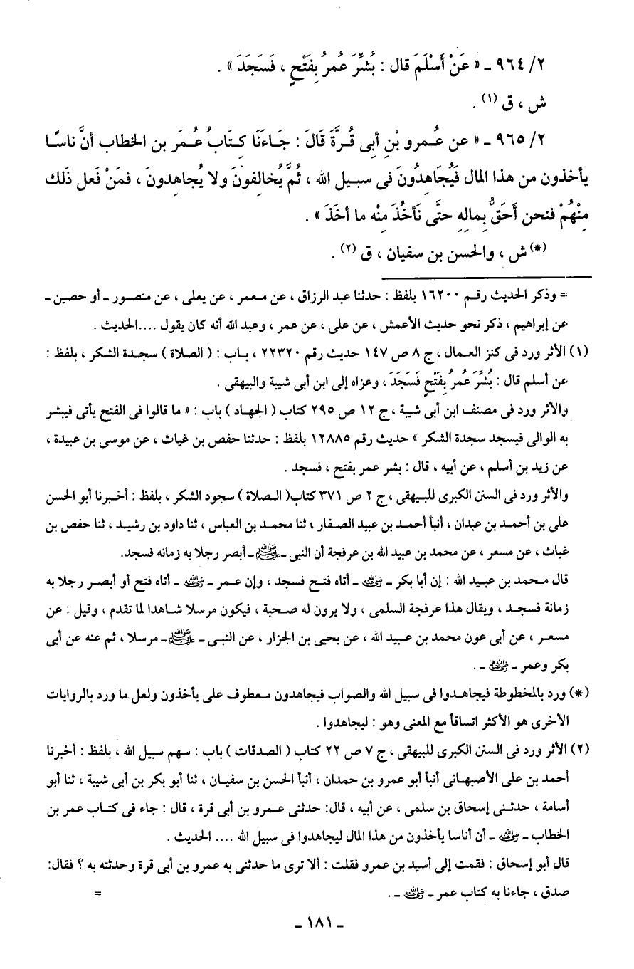 (¬1) الأثر ورد في كنز العمال، ج 8 ص 147 حديث رقم 22320، باب: (الصلاة) سجدة الشكر، بلفظ: عن أسلم قال: بُشِّرَ عُمرُ بِفَتْحٍ فَسَجَدَ، وعزاه إلى ابن أبى شيبة والبيهقى.