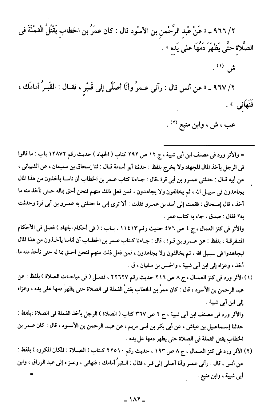 2/ 967 - "عن أنس قال: رآنى عمرُ وأنَا أصَلَّى إلى قَبْرٍ، فقال: القَبرُ أمامَك، فَنَهَانِى".