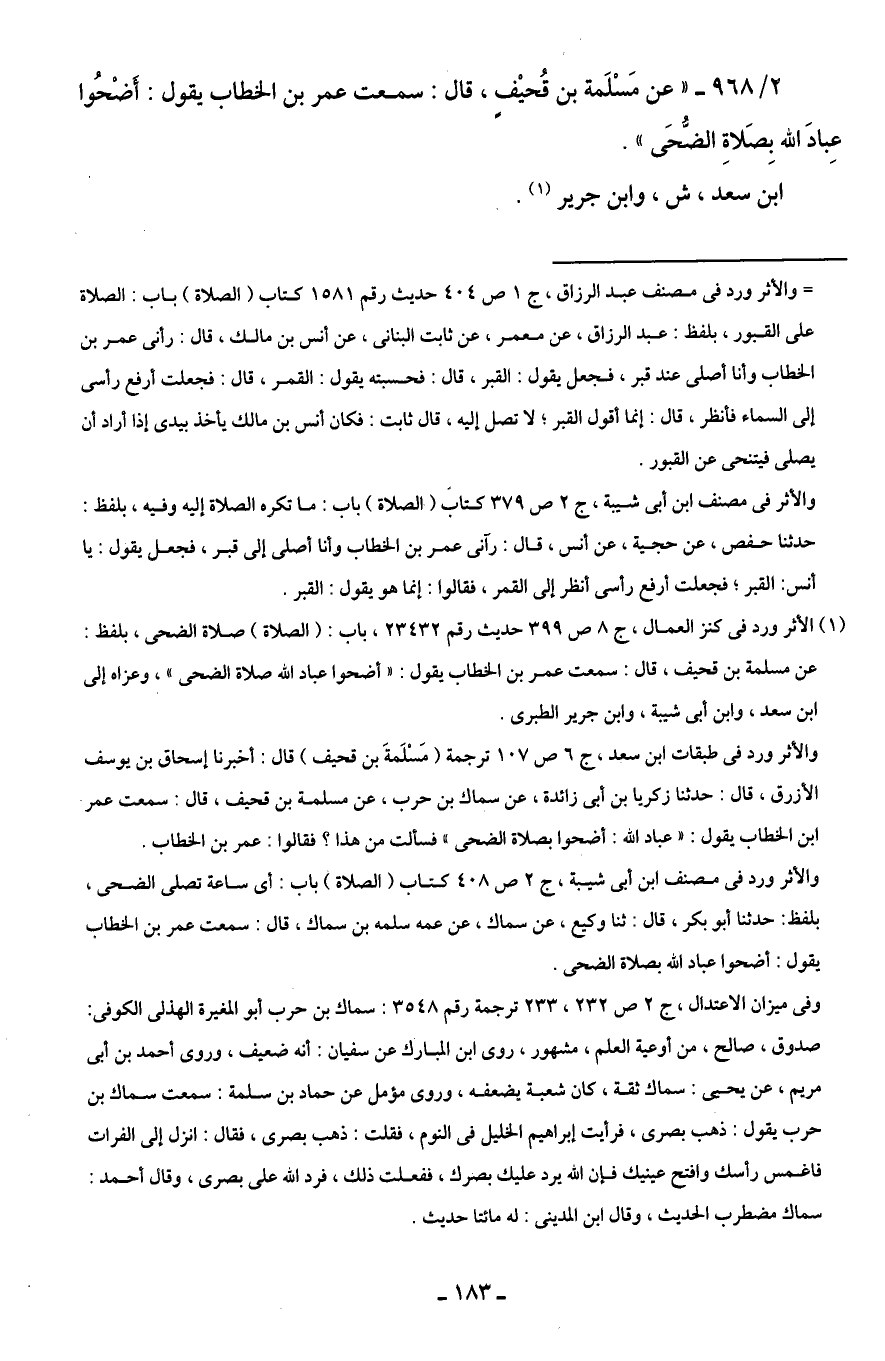 2/ 968 - "عن مَسْلَمة بن قُحيْفٍ، قال: سمعت عمر بن الخطاب يقول: أَضْحُوا عِبادَ الله بِصَلاةِ الضُّحَى".
