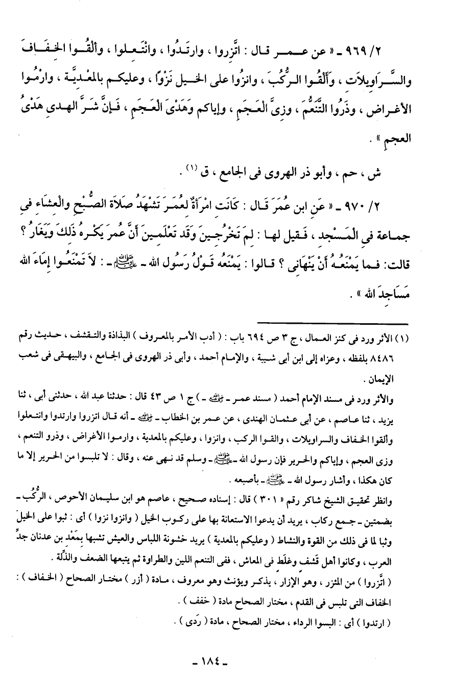 2/ 969 - "عن عمر قال: اتَّزِروا، وارتَدُوا، وانْتَعِلوا، وألْقُوا الخِفَافَ والسَّراوِيلَاتِ، وَأَلْقُوا الرُّكُبَ، وانزُوا على الخيل نَزْوًا، وعليكم بالمعْدِيَّة، وارْمُوا الأغراض، وذَرُوا التَّنَعُّمَ، وزِىَّ الْعَجَمِ، وإياكم وَهَدْىَ الْعَجَمِ، فَإنَّ شَرَّ الهدىِ هَدْىُ العجمِ".