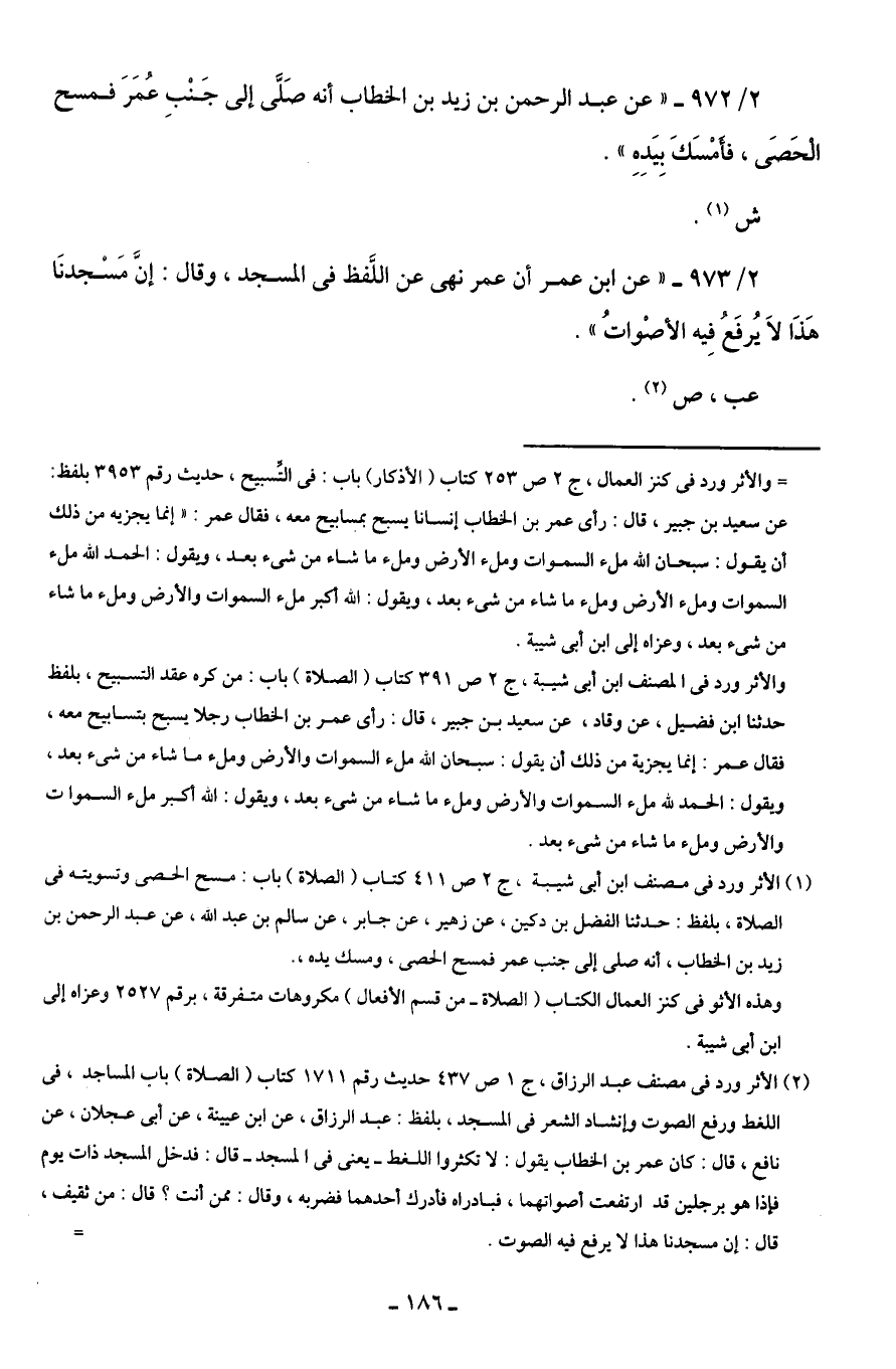 (¬1) الأثر ورد في مصنف ابن أبى شيبة، ج 2 ص 411 كتاب (الصلاة) باب: مسح الحصى وتسويته في الصلاة، بلفظ: حدثنا الفضل بن دكين، عن زهير، عن جابر، عن سالم بن عبد الله، عن عبد الرحمن بن زيد بن الخطاب، أنه صلى إلى جنب عمر فمسح الحصى، ومسك يده، .