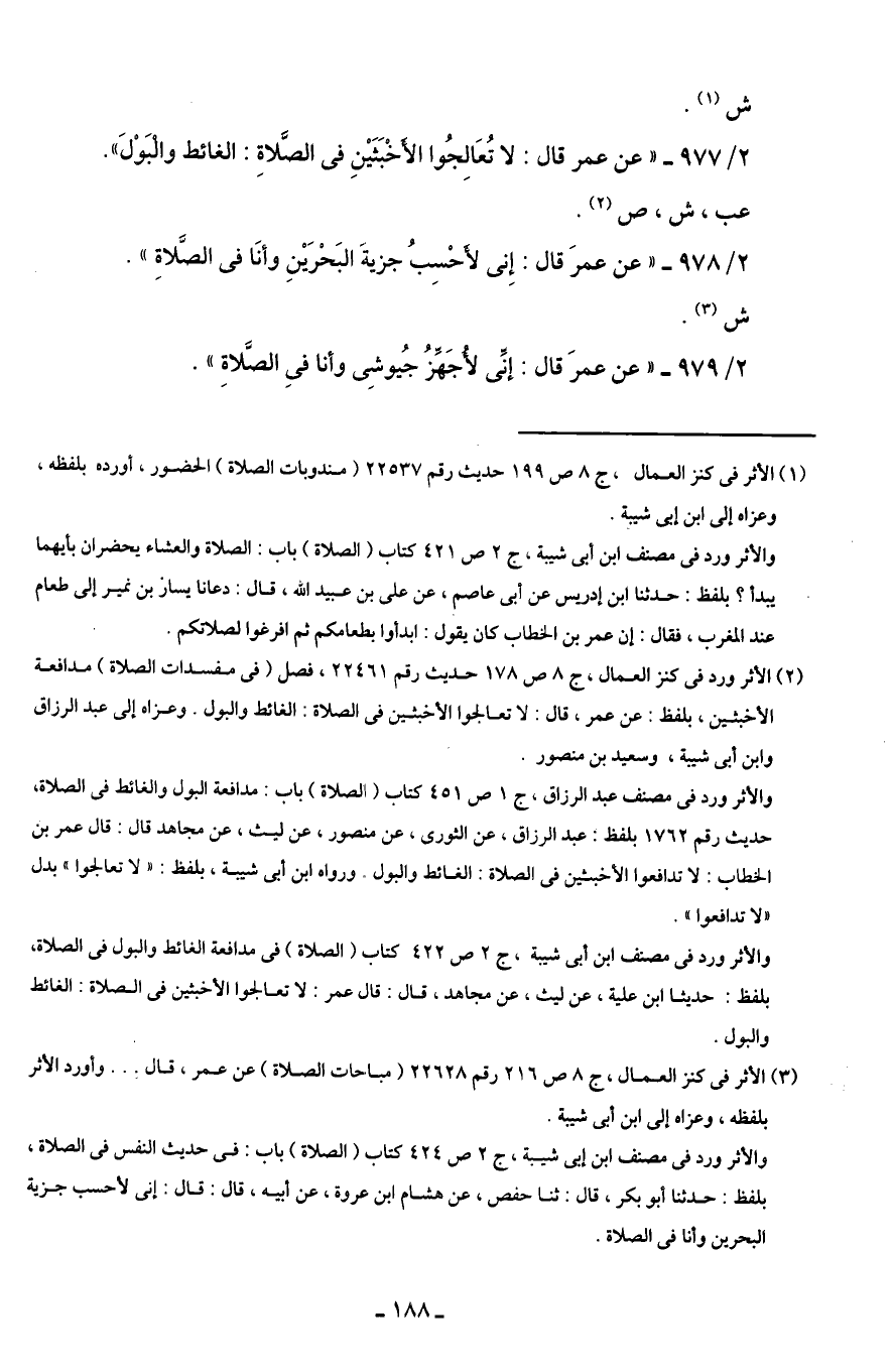 2/ 977 - "عن عمر قال: لا تُعَالِجُوا الأَخْبَثَيْنِ في الصَّلاةِ: الغائط والْبَوْلَ".