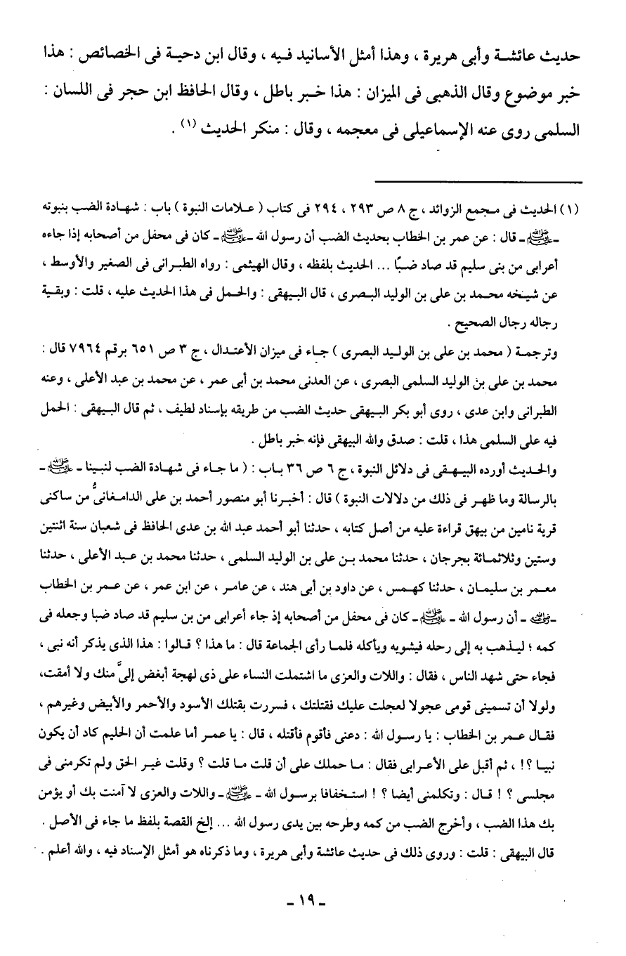 (¬1) الحديث في مجمع الزوائد، ج 8 ص 293، 294 في كتاب (علامات النبوة) باب: شهادة الضب بنبوته - صلى الله عليه وسلم - قال: عن عمر بن الخطاب بحديث الضب أن رسول الله - صلى الله عليه وسلم - كان في محفل من أصحابه إذا جاءه أعرابى من بنى سليم قد صاد ضبًا ... الحديث بلفظه، وقال الهيثمى: رواه الطبرانى في الصغير والأوسط، عن شيخه محمد بن على بن الوليد البصرى، قال البيهقى: والحمل في هذا الحديث عليه، قلت: وبقية رجاله رجال الصحيح.