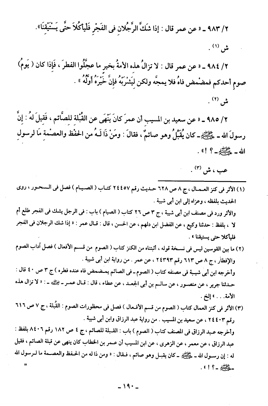 2/ 983 - "عن عمر قال: إذا شَكَّ الرَّجُلانِ في الفَجْرِ فَلْيأكُلَا حتَّى يَسْتَيْقِنَا".