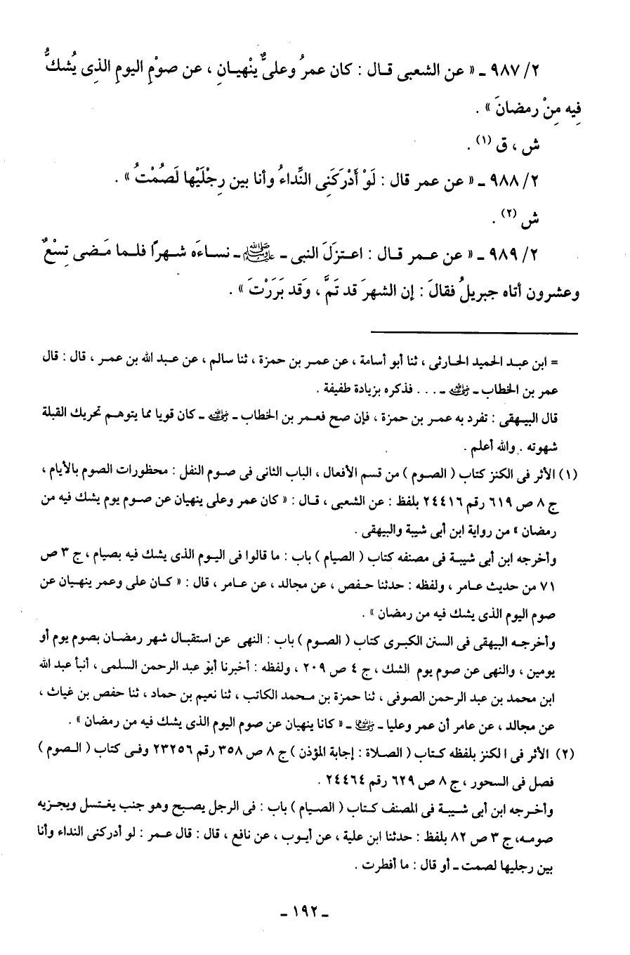 2/ 987 - "عن الشعبى قال: كان عمرُ وعلىٌّ ينْهيانِ، عن صوْمِ اليومِ الذِى يُشكُّ فِيه مِنْ رمضانَ".