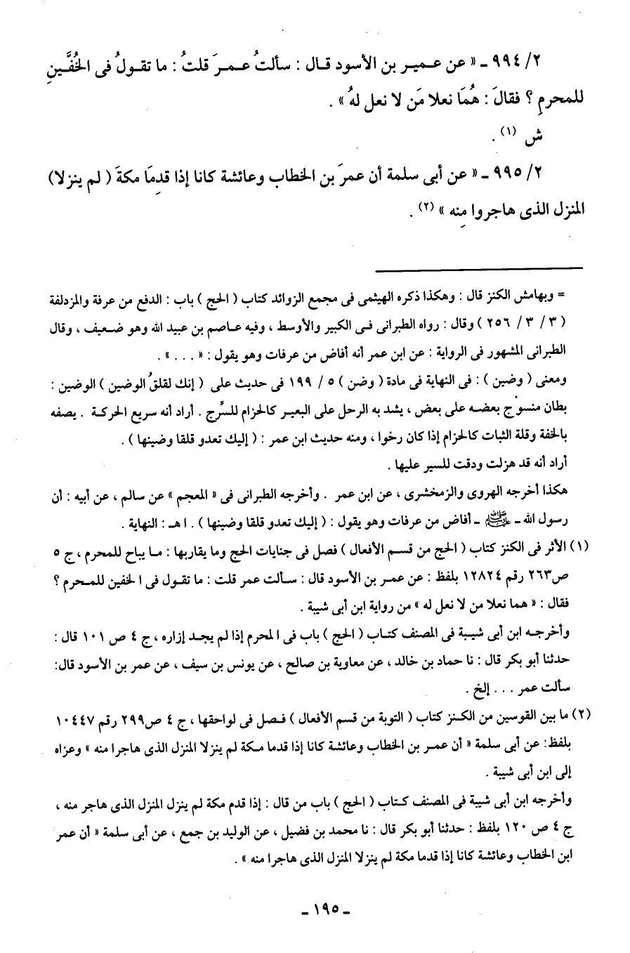 (¬1) الأثر في الكنز كتاب (الحج من قسم الأفعال) فصل في جنايات الحج وما يقاربها: ما يباح للمحرم، ج 5 ص 263 رقم 12824 بلفظ: عن عمر بن الأسود قال: سألت عمر قلت: ما تقول في الخفين للمحرم؟ فقال: "هما نعلا من لا نعل له" من رواية ابن أبى شيبة.