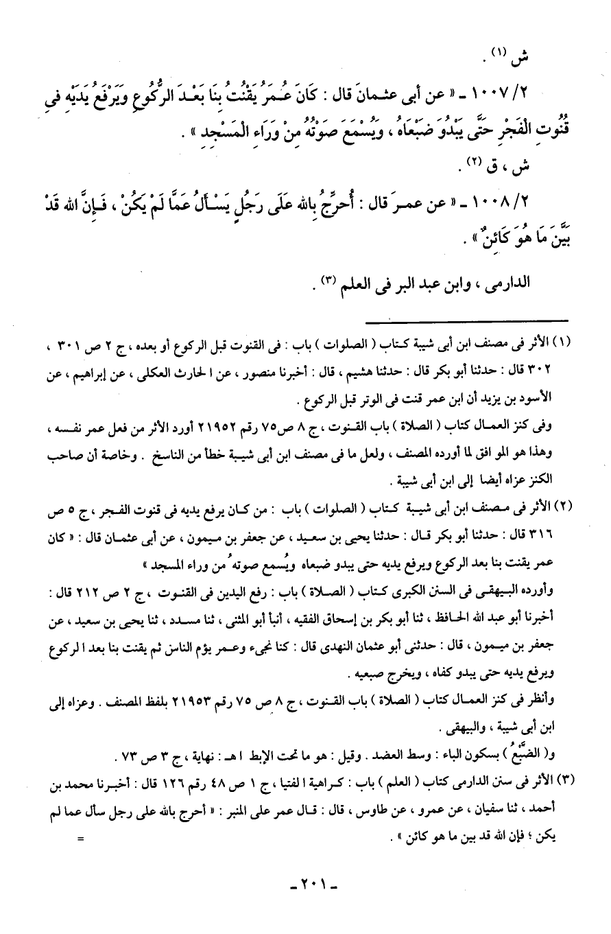 2/ 1007 - "عن أبى عثمانَ قال: كَانَ عُمَرُ يَقْنُتُ بنَا بَعْدَ الرُّكُوعِ وَيَرْفَعُ يَدَيْهِ فِى قُنُوتِ الْفَجْرِ حَتَّى يَبْدُوَ ضَبْعَاهُ، وَيُسْمَعَ صَوْتُهُ مِنْ وَرَاءِ الْمَسْجِدِ".