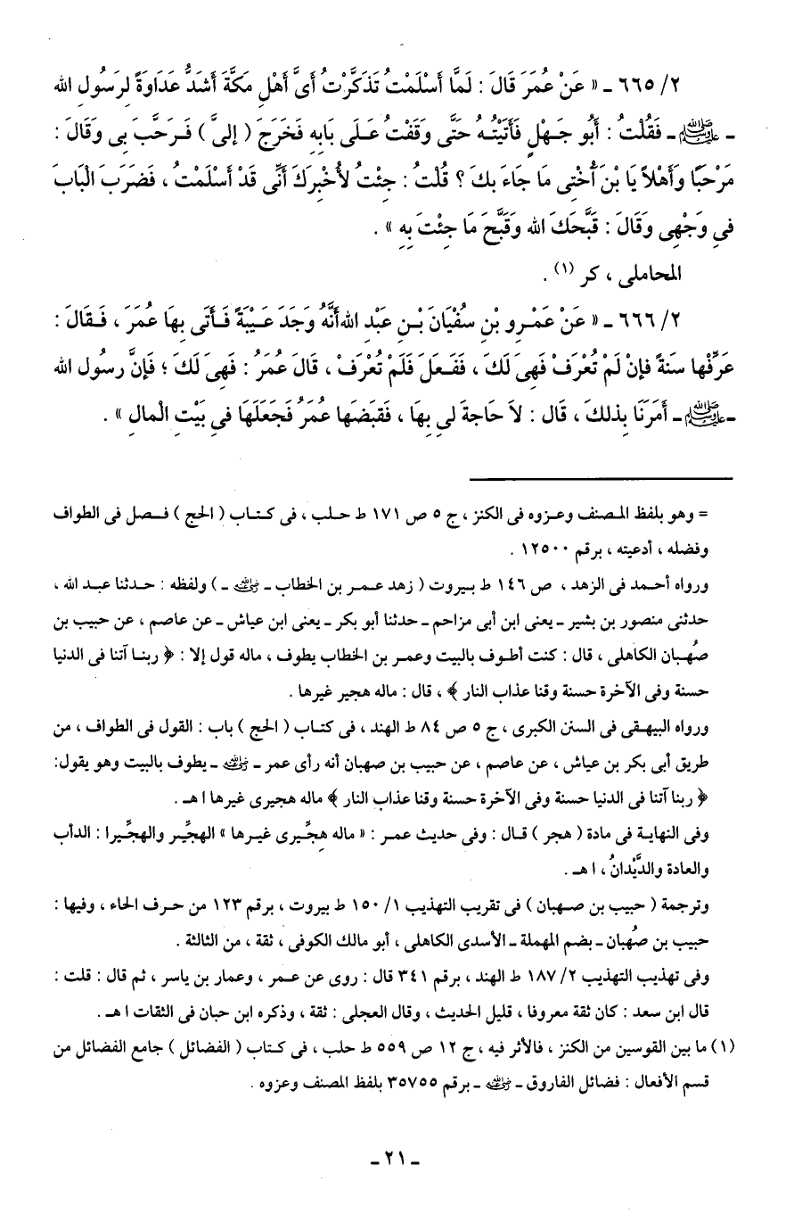 2/ 665 - "عَنْ عُمَرَ قَالَ: لَمَّا أَسْلَمْتُ تَذَكَّرْتُ أَىَّ أَهْلِ مَكَّةَ أَشَدُّ عَدَاوَةً لِرَسُولِ الله - صلى الله عليه وسلم - فَقُلتُ: أَبُو جَهْلٍ فَأَتَيْتُهُ حَتَّى وَقَفْتُ عَلَى بَابِهِ فَخَرَجَ (إلىَّ) فَرَحَّبَ بِى وَقَالَ: مَرْحَبًا وَأَهْلًا يَا بْنَ أُخْتِى مَا جَاءَ بكَ؟ قُلْتُ: جِئْتُ لأُخْبِرَكَ أَنِّى قَدْ أَسْلَمْتُ، فَضَرَبَ الْبَابَ فِى وَجْهِى وَقَالَ: قَبَّحَكَ الله وَقَبَّحَ مَا جِئْتَ بِهِ".
