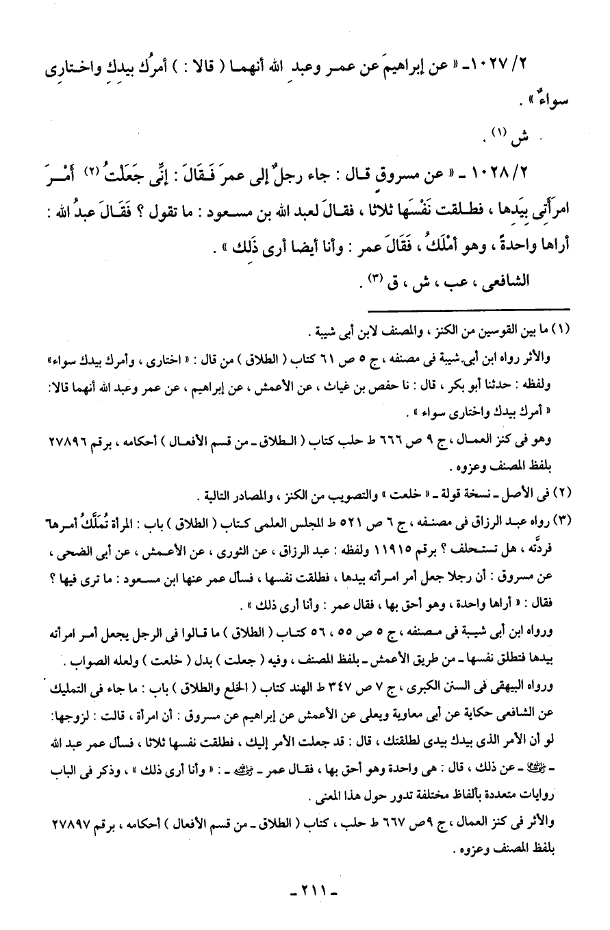 2/ 1027 - "عن إبراهيمَ عن عمر وعبدِ الله أنهما (قالا: ) أمرُك بيدِكِ واختارِى سواءٌ".