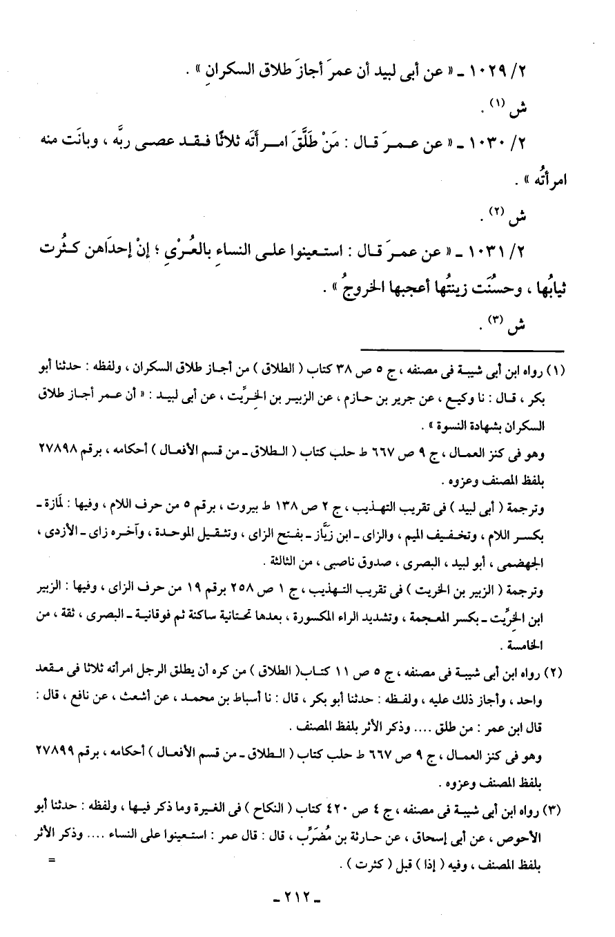 (¬1) رواه ابن أبى شيبة في مصنفه، ج 5 ص 38 كتاب (الطلاق) من أجاز طلاق السكران، ولفظه: حدثنا أبو بكر، قال: نا وكيع، عن جرير بن حازم، عن الزبير بن الخِرِّيت، عن أبى لبيد: "أن عمر أجاز طلاق السكران بشهادة النسوة".