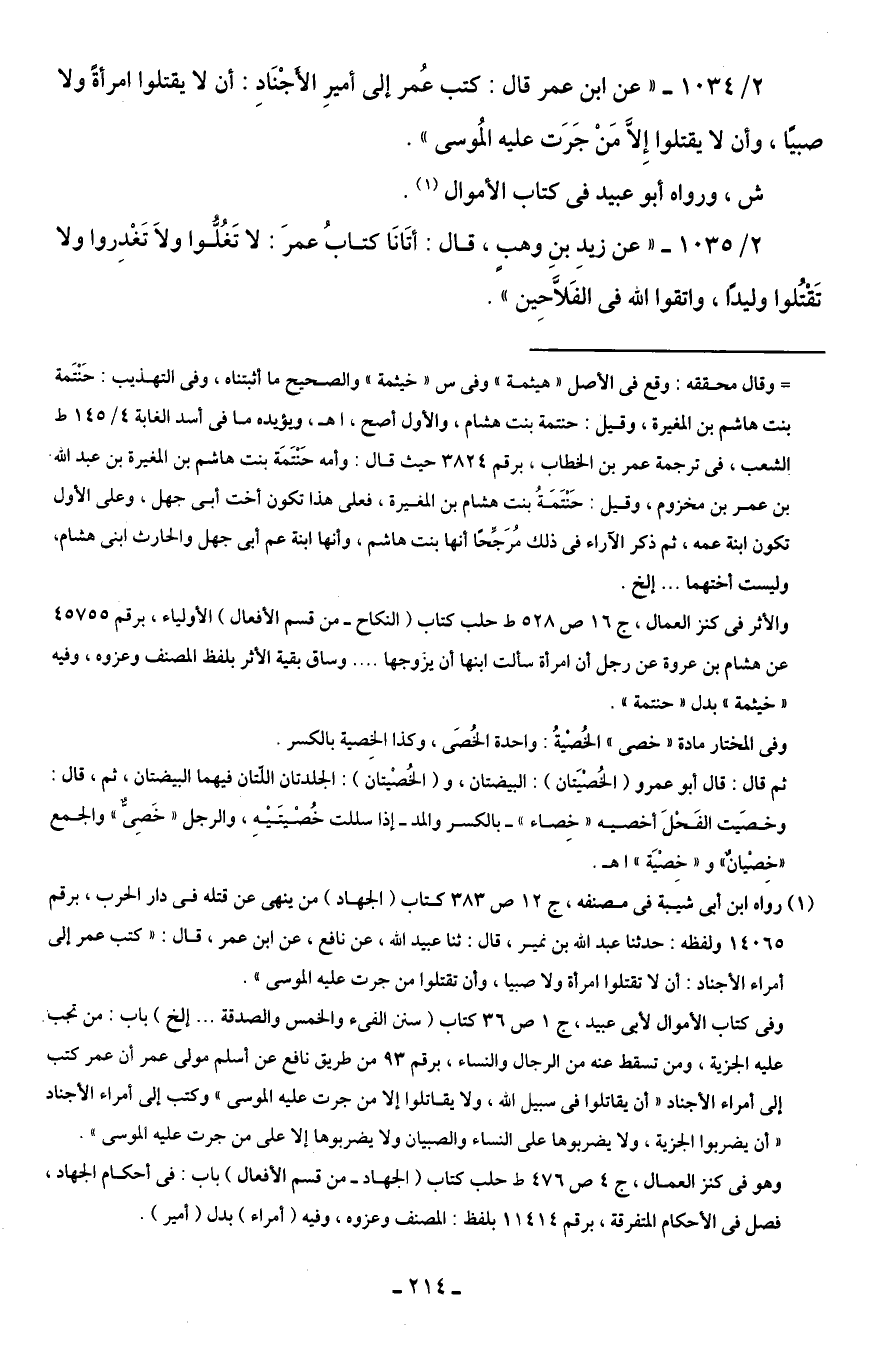 2/ 1034 - "عن ابن عمر قال: كتب عُمر إلى أميرِ الأَجْنَادِ: أن لا يقتلوا امرأةً ولا صبيًا، وأن لا يقتلوا إِلَّا مَنْ جَرَت عليه المُوسى".
