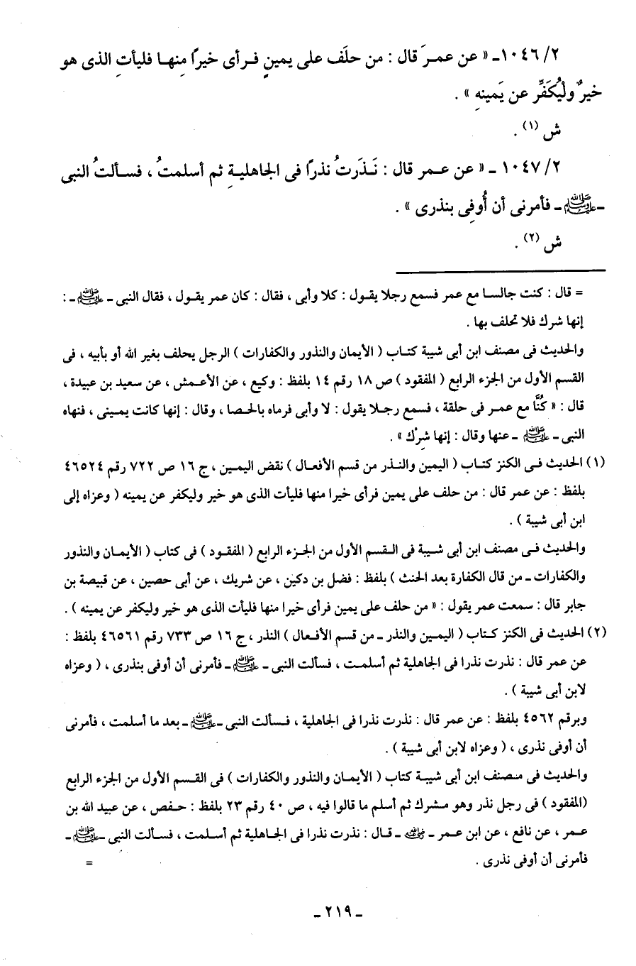 2/ 1047 - "عن عمر قال: نَذَرتُ نذرًا في الجاهليةِ ثم أسلمتُ، فسألتُ النبى - صلى الله عليه وسلم - فأمرنى أن أُوفِى بنذرى".