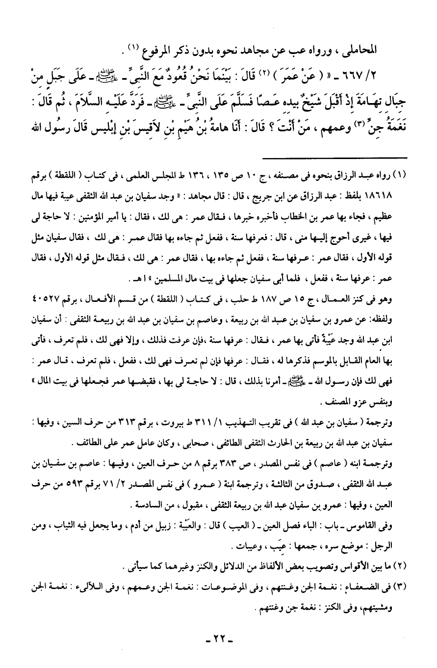 (¬1) رواه عبد الرزاق بنحوه في مصنفه، ج 10 ص 135، 136 ط المجلس العلمى، في كتاب (اللقطة) برقم 18618 بلفظ: عبد الرزاق عن ابن جريج، قال: قال مجاهد: "وجد سفيان بن عبد الله الثقفى عيبة فيها مال عظيم، فجاء بها عمر بن الخطاب فأخبره خبرها، فقال عمر: هى لك، فقال: يا أمير المؤمنين: لا حاجة لى فيها، غيرى أحوج إليها منى، قال: فعرفها سنة، ففعل ثم جاءه بها فقال عمر: هى لك، فقال سفيان مثل قوله الأول، فقال عمر: عرفها سنة، ففعل ثم جاءه بها، فقال عمر: هى لك، فقال مثل قوله الأول، فقال عمر: عرفها سنة، ففعل، فلما أبى سفيان جعلها في بيت مال المسلمين" اهـ.