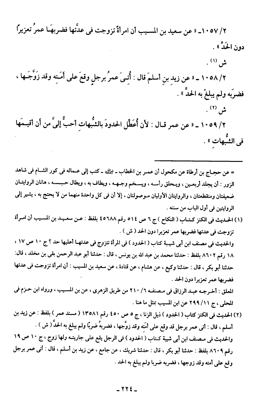 (¬2) الحديث في الكنز كتاب (الحدود) ذيل الزنا، ج 5 ص 450 رقم 13581 (مسند عمر) بلفظ: عن زيد بن أسلم، قال: أتى عمر برجل قد وقع على أمَتِه وقد زوَّجها، فضربهُ ضربًا ولم يبلغ به الحدَّ (ش).