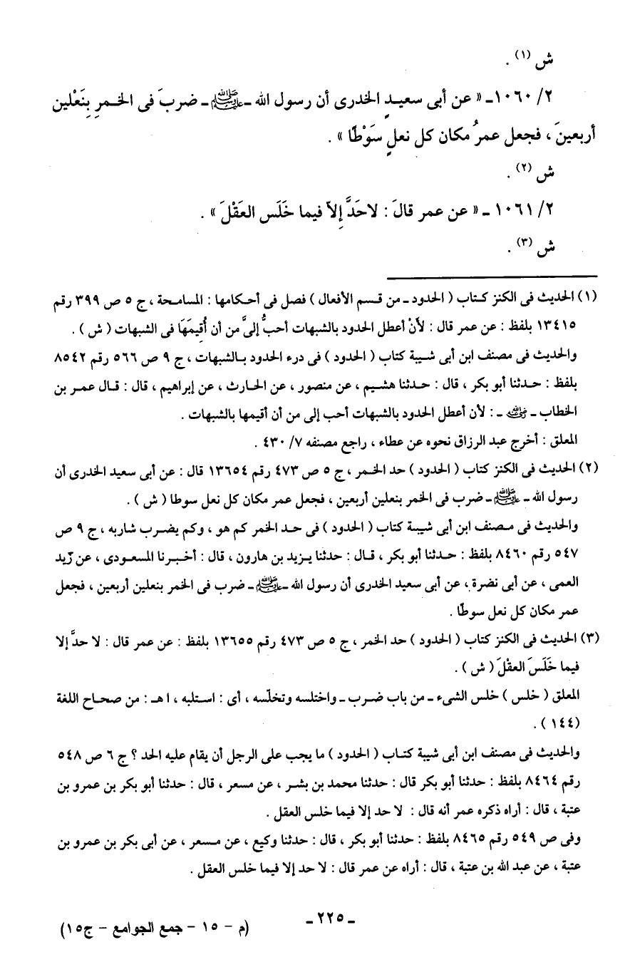 (¬3) الحديث في الكنز كتاب (الحدود) حد الخمر، ج 5 ص 473 رقم 13655 بلفظ: عن عمر قال: لا حدَّ إلا فيما خَلَسَ العقْلَ (ش).