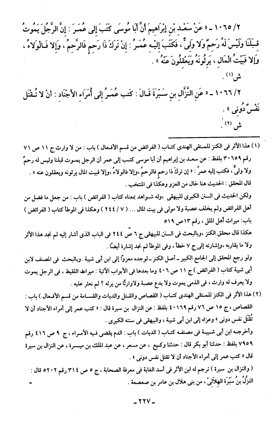 2/ 1066 - "عَنِ النَّزَّالِ بنِ سَبْرَةَ قَالَ: كَتب عُمَرُ إِلى أُمَرَاءِ الأَجْنَادِ: أنْ لا تُقْتَل نَفْسٌ دُونِى".