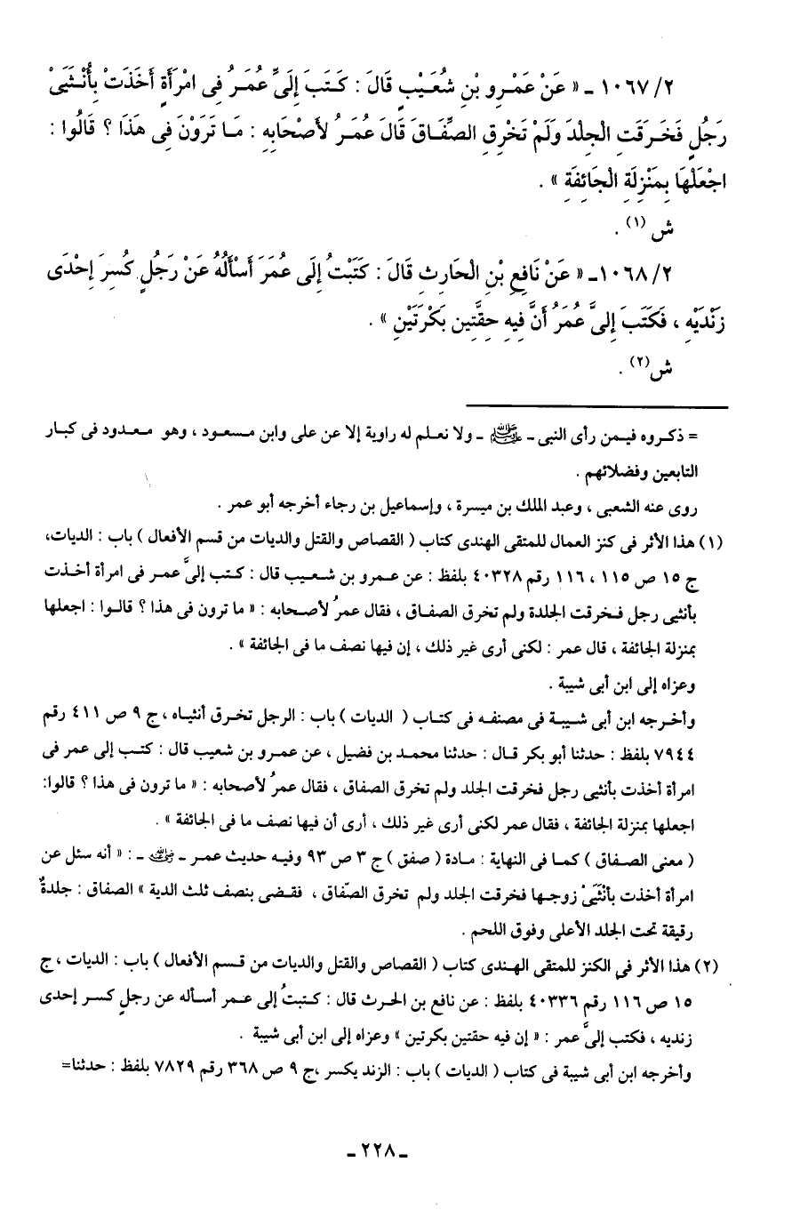 (¬2) هذا الأثر في الكنز للمتقى الهندى كتاب (القصاص والقتل والديات من قسم الأفعال) باب: الديات، ج 15 ص 116 رقم 40336 بلفظ: عن نافع بن الحرث قال: كتبتُ إلى عمر أسأله عن رجلٍ كسر إحدى زنديه، فكتب إلىَّ عمر: "إن فيه حقتين بكرتين" وعزاه إلى ابن أبى شيبة.