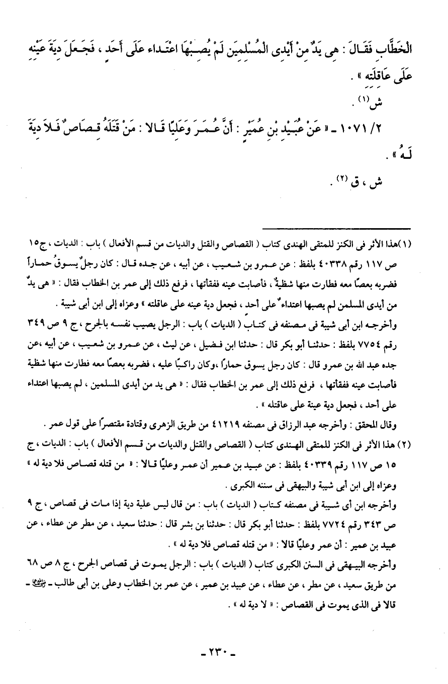 (¬2) هذا الأثر في الكنز للمتقى الهندى كتاب (القصاص والقتل والديات من قسم الأفعال) باب: الديات، ج 15 ص 117 رقم 40339 بلفظ: عن عبيد بن عمير أن عمر وعليًا قالا: "من قتله قصاص فلا دية له" وعزاه إلى ابن أبى شيبة والبيهقى في سننه الكبرى.