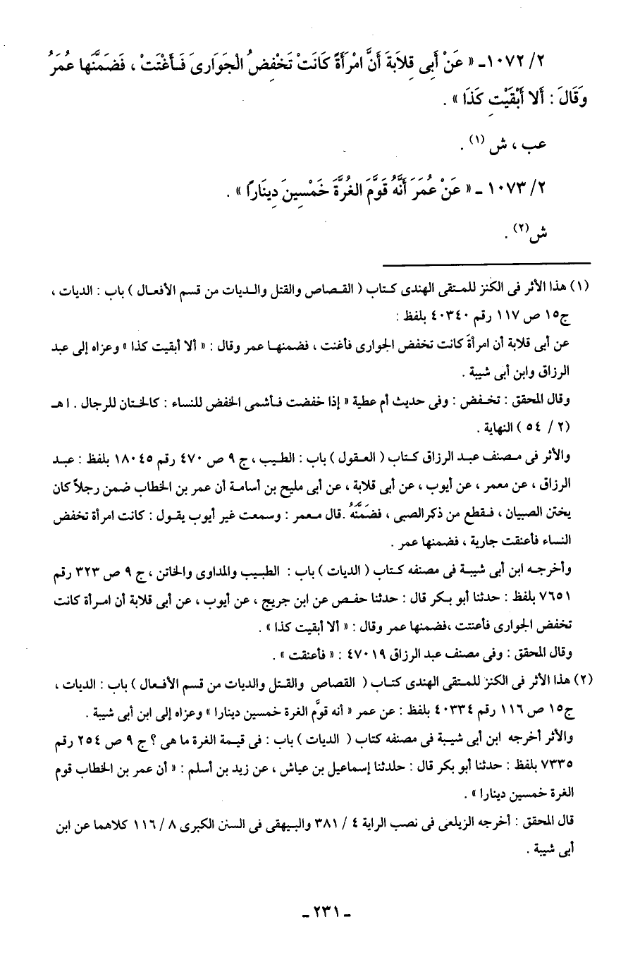 2/ 1073 - "عَنْ عُمَرَ أَنَّهُ قَوَّمَ الغُرَّةَ خَمْسِينَ دِينَارًا".