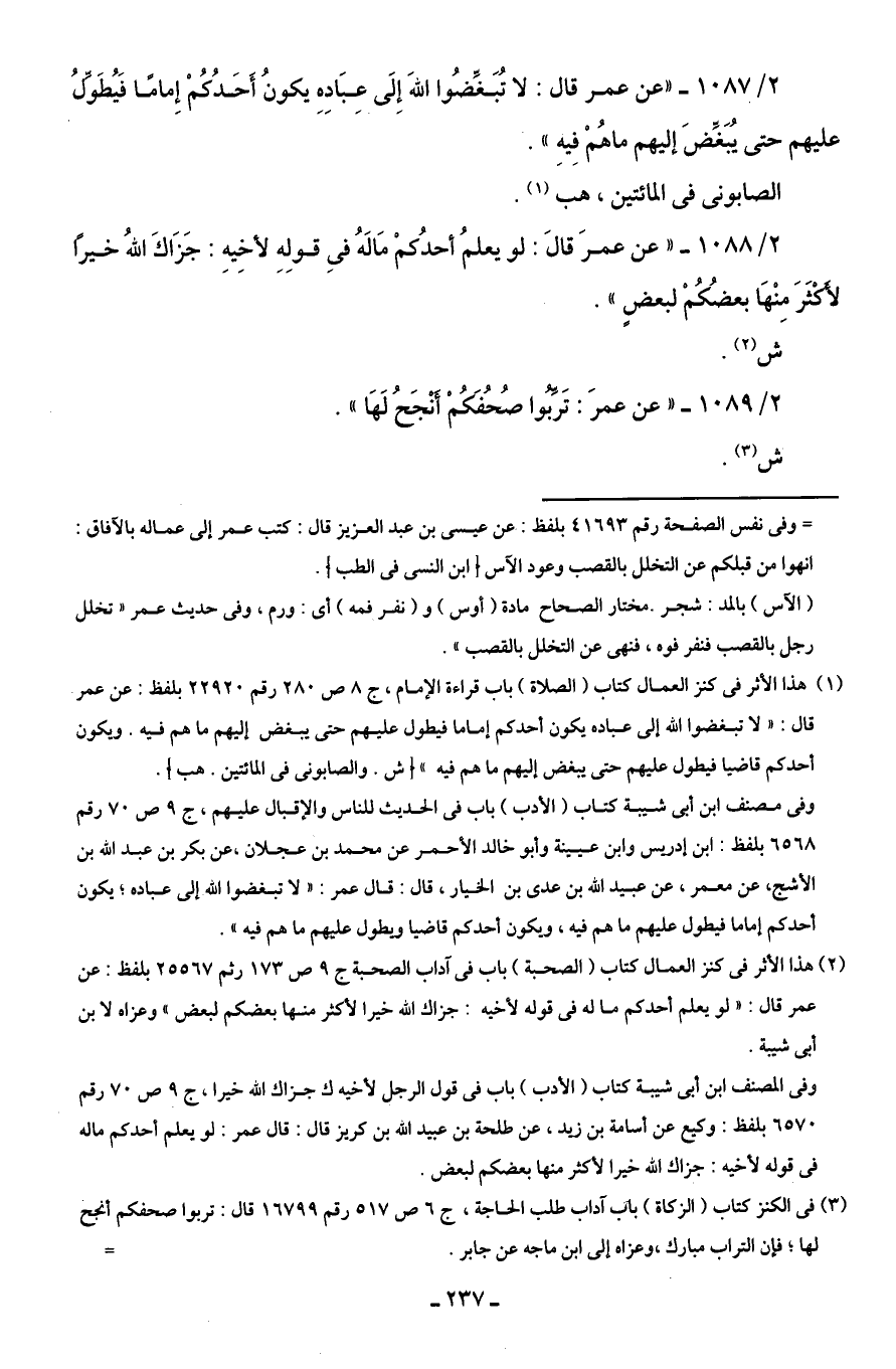 2/ 1087 - "عن عمر قال: لا تُبَغِّضُوا اللهَ إِلَى عِبَادِهِ يكونُ أَحَدُكُمْ إِمامًا فَيُطَوِّلُ عليهم حتى يُبَغِّضَ إليهم ما هُمْ فِيهِ".