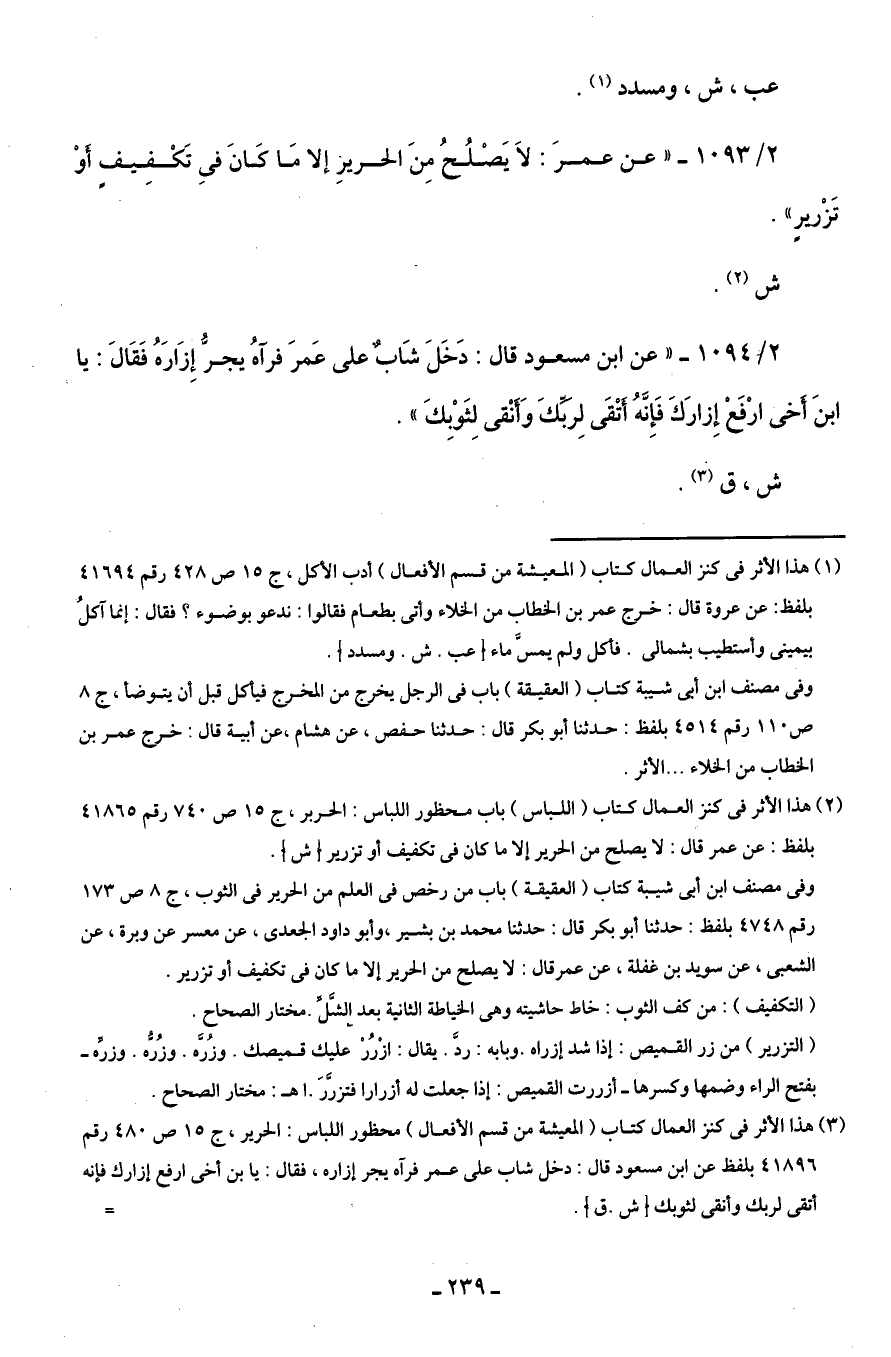 2/ 1093 - "عن عمرَ: لَا يَصْلُحُ مِنَ الحريرِ إلا مَا كَانَ فِي تَكْفِيفٍ أَوْ تَزْريرٍ"