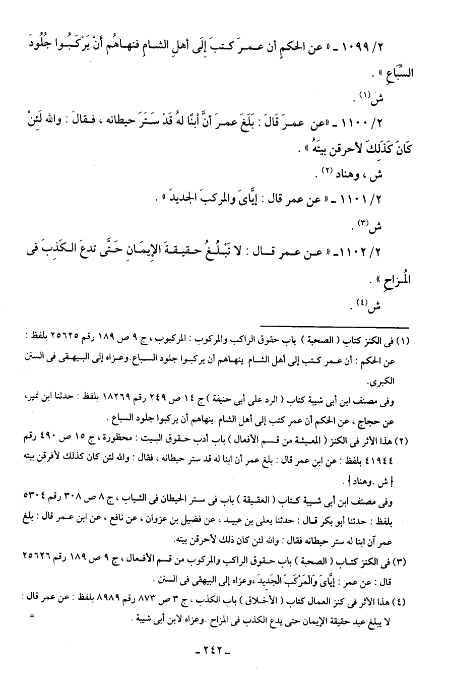 2/ 1099 - "عن الحكم أن عمرَ كتبَ إِلَى أهلِ الشامِ فنهاهُم أَنْ يَرْكَبُوا جُلُودَ لسِّبَاعِ".