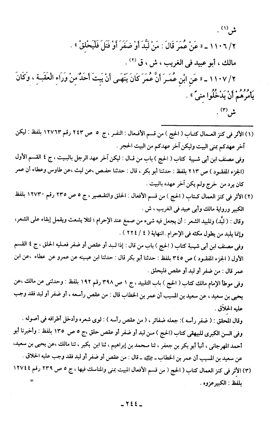 (¬2) الأثر في كنز العمال كتاب (الحج) من قسم الأفعال: الحلق والتقصير، ج 5 ص 235 رقم 12730 بلفظ الكبير ورواية مالك وأبى عبيد في الغريب، ش.