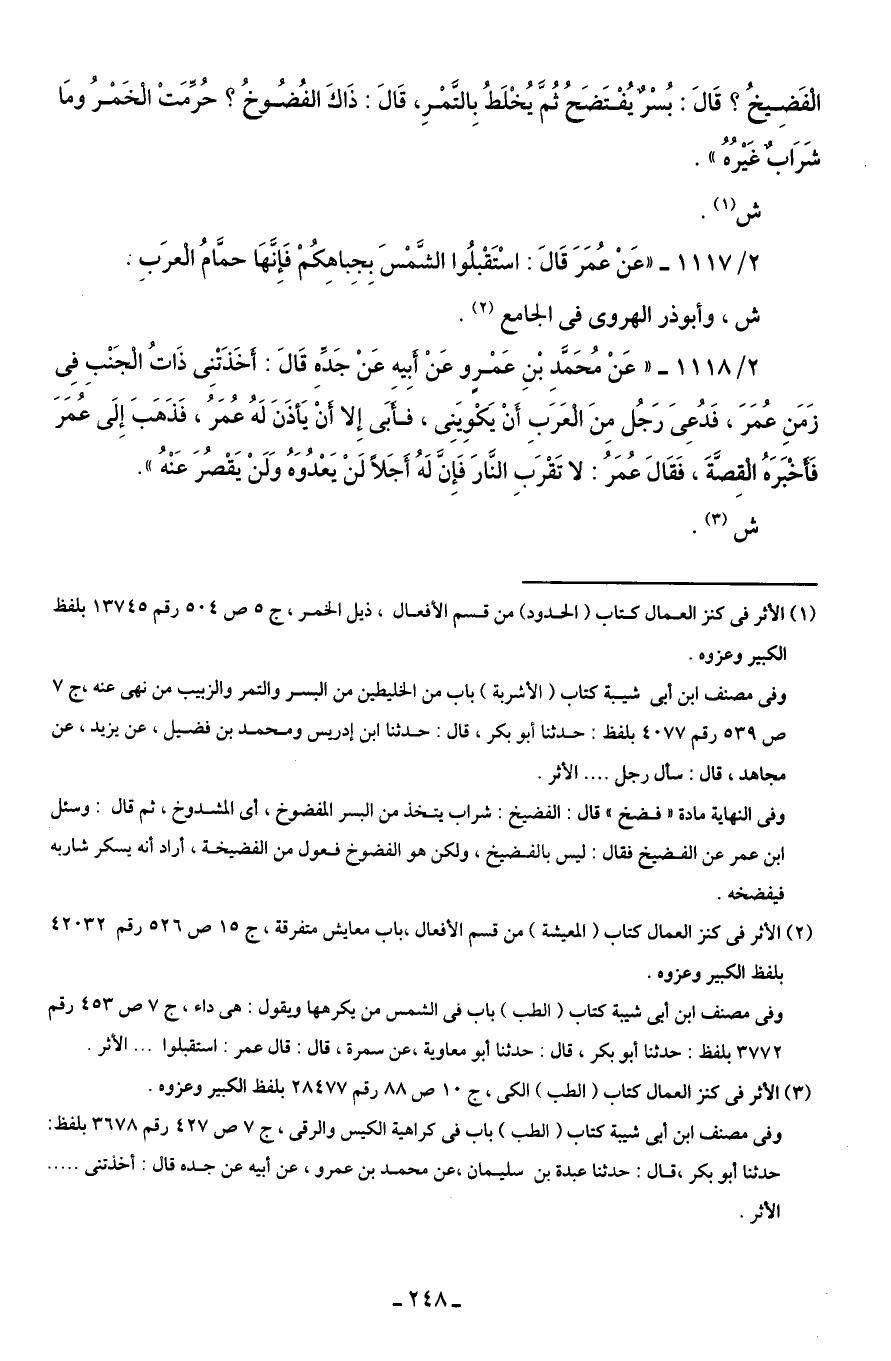 2/ 1117 - "عَنْ عُمَرَ قَالَ: اسْتَقْبلُوا الشَّمْسَ بِجِباهِكُمْ فَإِنَّهَا حمَّامُ الْعرَبِ: