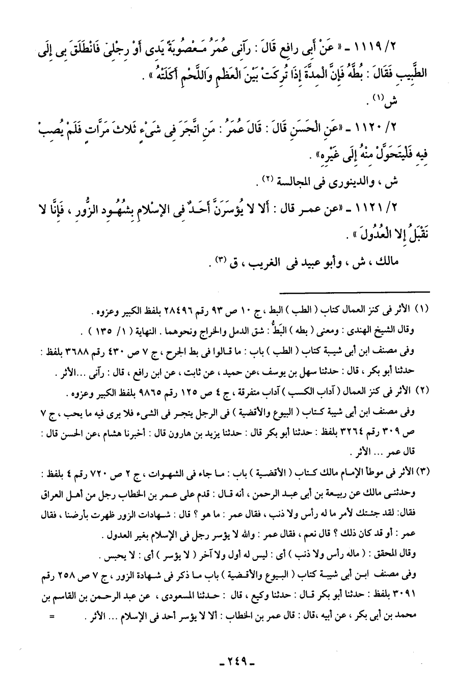 2/ 1121 - "عن عمر قال: ألا لا يُؤسَرَنَّ أَحَدٌ في الإسْلامِ بِشُهُوِد الزُّورِ، فَإنَّا لا نَقْبَلُ إِلا الْعُدُولَ".
