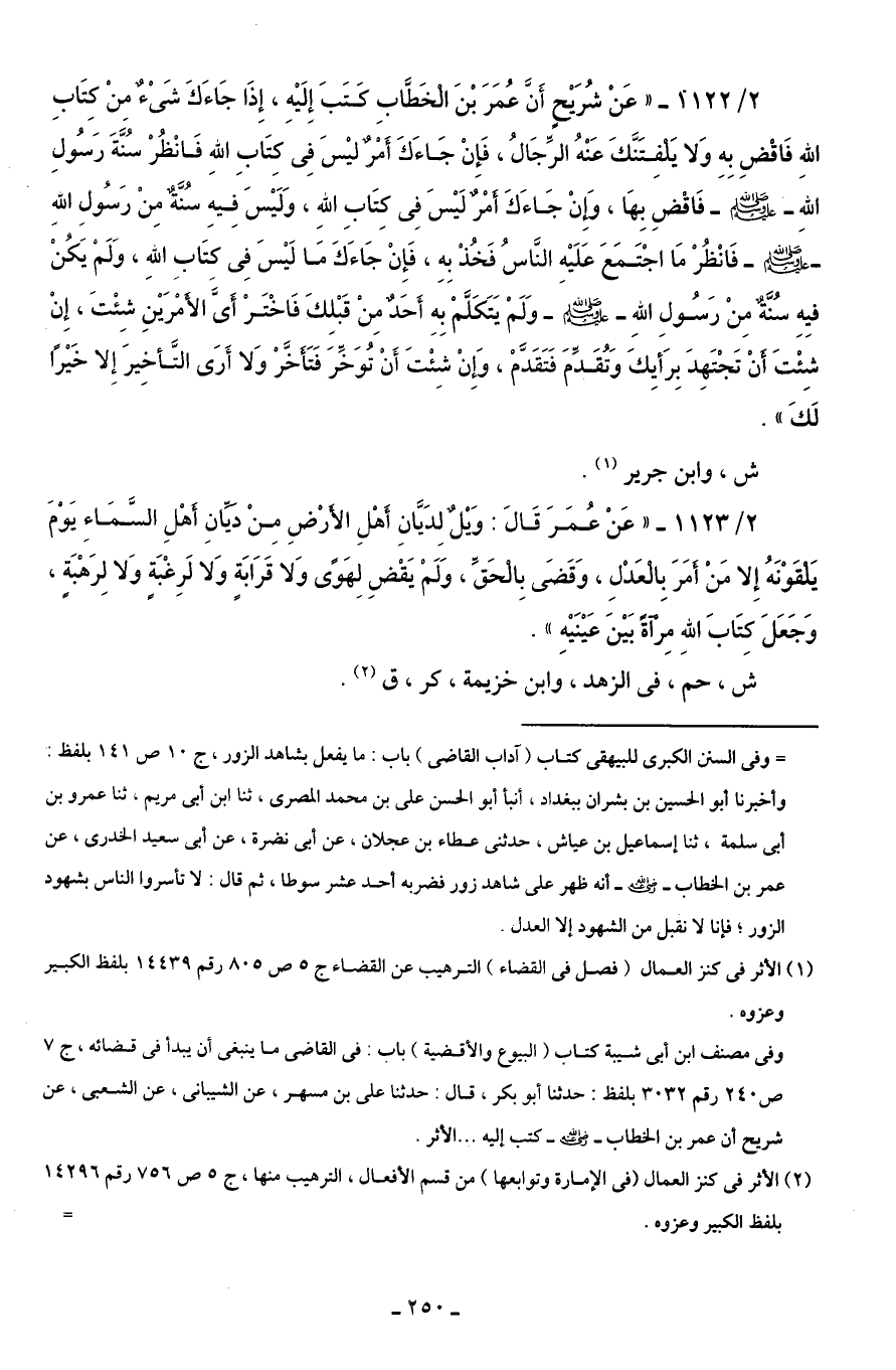 2/ 1122 - "عَنْ شُرَيْحٍ أَنَّ عُمَرَ بْنَ الْخَطَّابِ كَتَبَ إِلَيْهِ، إِذَا جَاءَكَ شَىْءٌ مِنْ كِتَابِ اللهِ فَاقْضِ بِهِ وَلا يَلْفِتَنَّكَ عَنْهُ الرِّجَالُ، فَإِنْ جَاءَكَ أَمْرٌ ليْسَ فِي كِتَابِ اللهِ فَانْظُرْ سُنَّةَ رَسُولِ اللهِ - صلى الله عليه وسلم - فَاقْضِ بِهَا، وَإِنْ جَاءَكَ أَمْرٌ لَيْسَ فِي كِتَابِ اللهِ، وَلَيْسَ فِيهِ سُنَّةٌ مِن رَسُولِ اللهِ - صلى الله عليه وسلم - فَانْظُرْ مَا اجْتَمَعَ عَلَيْهِ النَّاسُ فَخُذْ بِهِ، فَإِنْ جَاءَكَ مَا لَيْسَ فِي كِتَابِ اللهِ، وَلَمْ يَكُنْ فيِهِ سُنَّةٌ مِنْ رَسُولِ اللهِ - صلى الله عليه وسلم - وَلَمْ يَتَكَلَّمْ بِهِ أَحَدٌ مِنْ قَبْلِكَ فَاخْتَرْ أَىَّ الأَمْرَيْنِ شِئْتَ، إِنْ شِئْتَ أَنْ تَجْتَهِدَ بِرَأيِكَ وَتُقَدِّمَ فَتَقَدَّمْ، وَإِنْ شِئْتَ أَنْ تُوَخِّرَ فَتَأخَّرْ وَلا أَرَى التَّأخِيرَ إِلا خَيْرًا لَكَ".