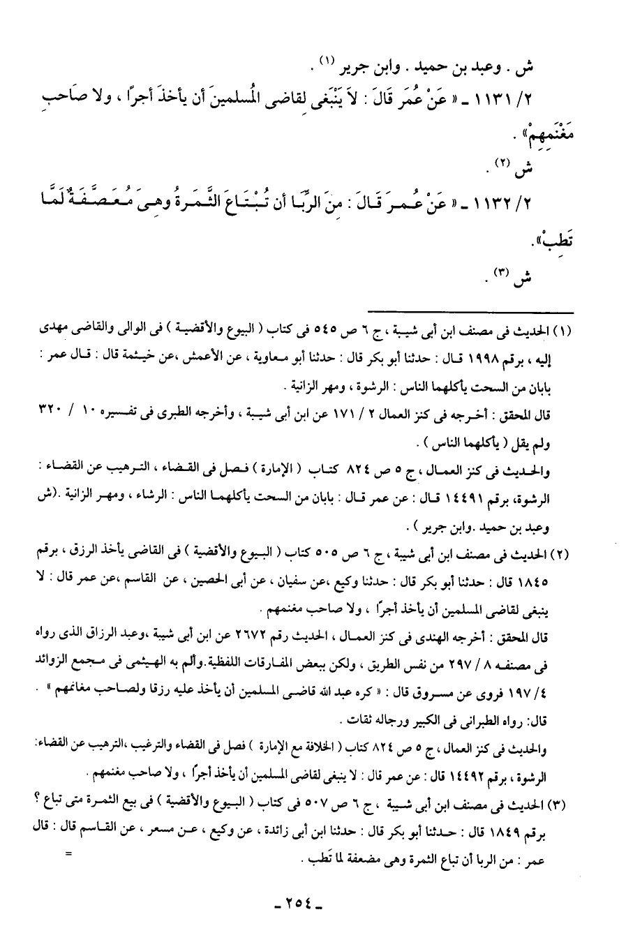 (¬2) الحديث في مصنف ابن أبى شيبة، ج 6 ص 505 كتاب (البيوع والأقضية) في القاضى يأخذ الرزق، برقم 1845 قال: حدثنا أبو بكر قال: حدثنا وكيع، عن سفيان، عن أبى الحصين، عن القاسم، عن عمر قال: لا ينبغى لقاضى المسلمين أن يأخذ أجرًا، ولا صاحب مغنمهم.