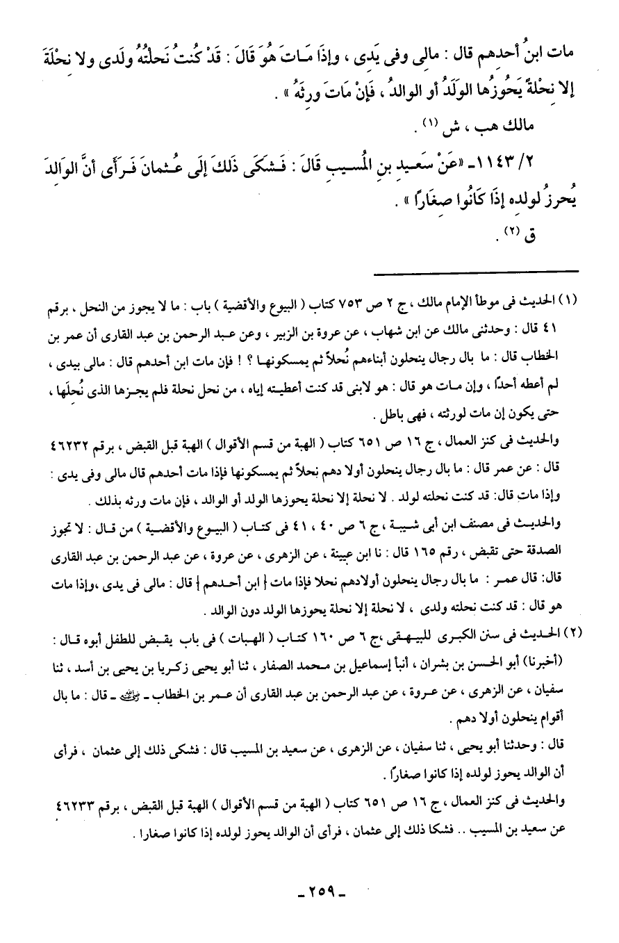 (¬2) الحديث في سنن الكبرى للبيهقى، ج 6 ص 160 كتاب (الهبات) في باب يقبض للطفل أبوه قال: (أخبرنا) أبو الحسن بن بشران، أنبأ إسماعيل بن محمد الصفار، ثنا أبو يحيى زكريا بن يحيى بن أسد، ثنا سفيان، عن الزهرى، عن عروة، عن عبد الرحمن بن عبد القارى أن عمر بن الخطاب - رضي الله عنه - قال: ما بال أقوام ينحلون أولادهم.