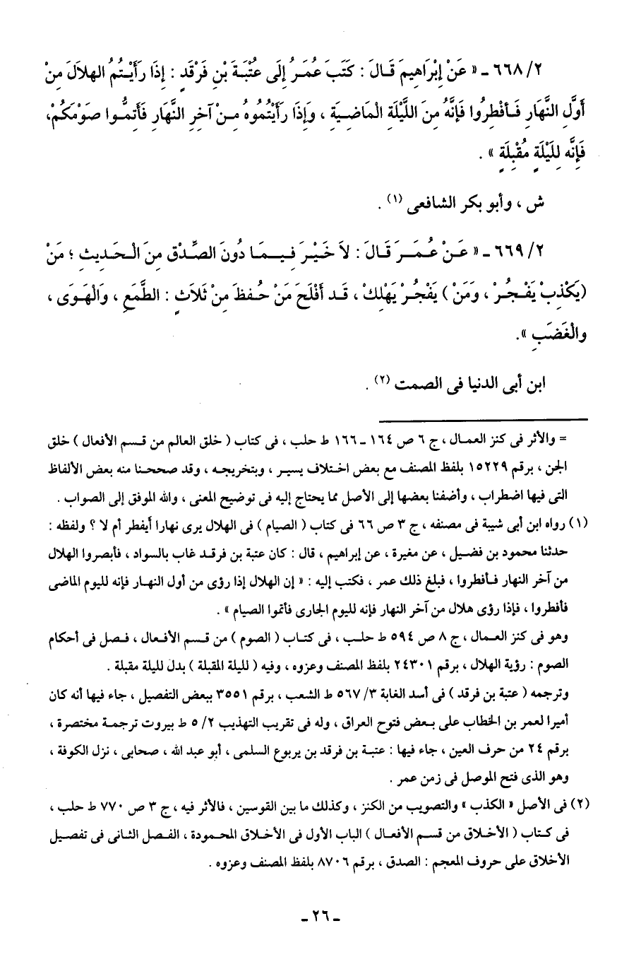 2/ 668 - "عَنْ إِبْرَاهِيمَ قَالَ: كَتَبَ عُمَرُ إِلَى عُتْبَةَ بْنِ فَرْقَدٍ: إِذَا رَأَيْتُمُ الهلَالَ مِنْ أَوَّلِ النَّهَارِ فَأفْطِرُوا فَإنَّهُ مِنَ اللَّيْلَةِ الْمَاضِيَةِ، وَإِذَا رَأَيْتُمُوهُ مِنْ آخِرِ النَّهَارِ فَأَتِمُّوا صَوْمَكُمْ، فَإِنَّه لِلَيْلَةٍ مُقْبِلَةٍ".