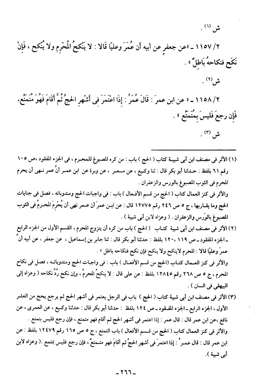 (¬2) الأثر في مصنف ابن أبى شيبة كتاب (الحج) باب من كره أن يتزوج المحرم، القسم الأول من الجزء الرابع - الجزء المفقود - ص 119, 120 بلفظ: حدثنا أبو بكر قال: ثنا جابر بن إسماعيل، عن جعفر، عن أبيه أنَّ عمرَ وعليًا قالا: المحرم لا ينكح ولا ينكح فإن نكح فنكاحه باطل".