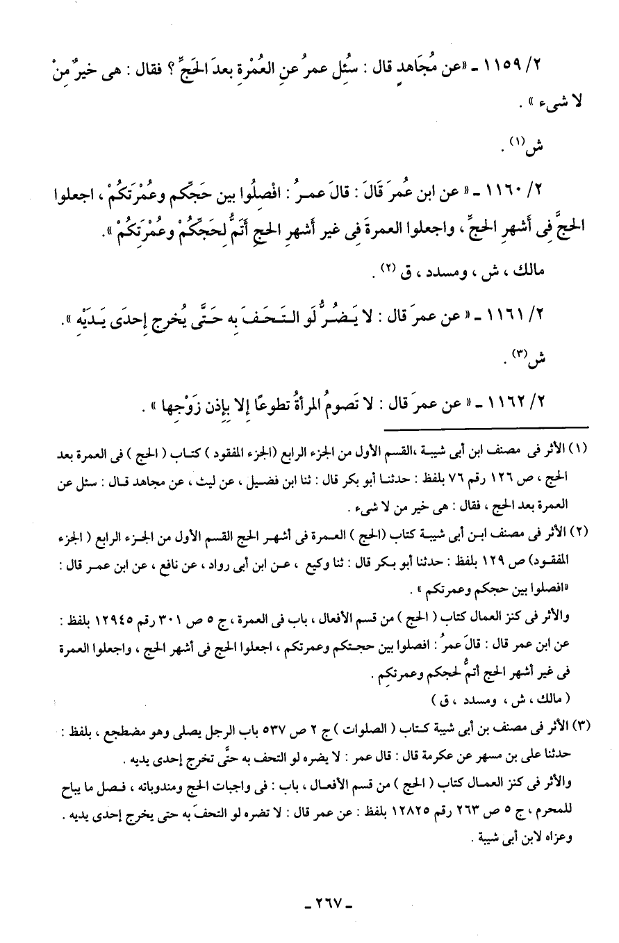 2/ 1160 - "عن ابن عُمرَ قَالَ: قالَ عمرُ: افْصِلُوا بين حَجِّكم وعُمْرَتكُمْ، اجعلوا الحجَّ في أَشهرِ الحجِّ، واجعلوا العمرةَ فِي غير أَشهرِ الحجِ أَتَمُّ لِحَجِّكُمْ وعُمْرَتِكُمْ".